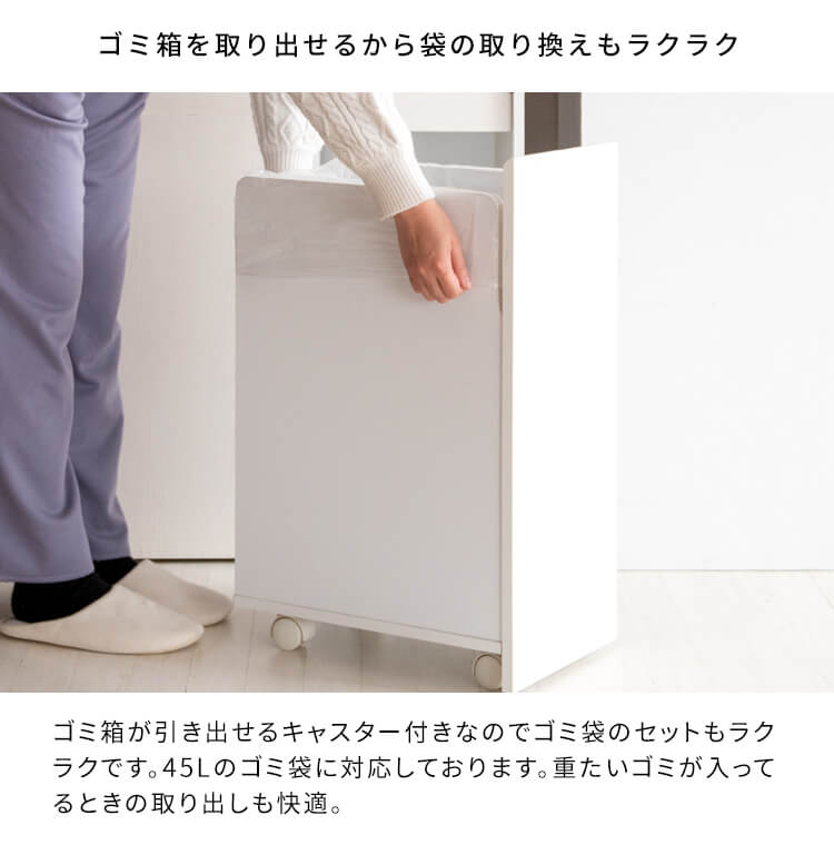 ゴミ箱は手元までサッと移動できるキャスター付きで、ゴミ捨ての際も取り出してすぐ回収できます。