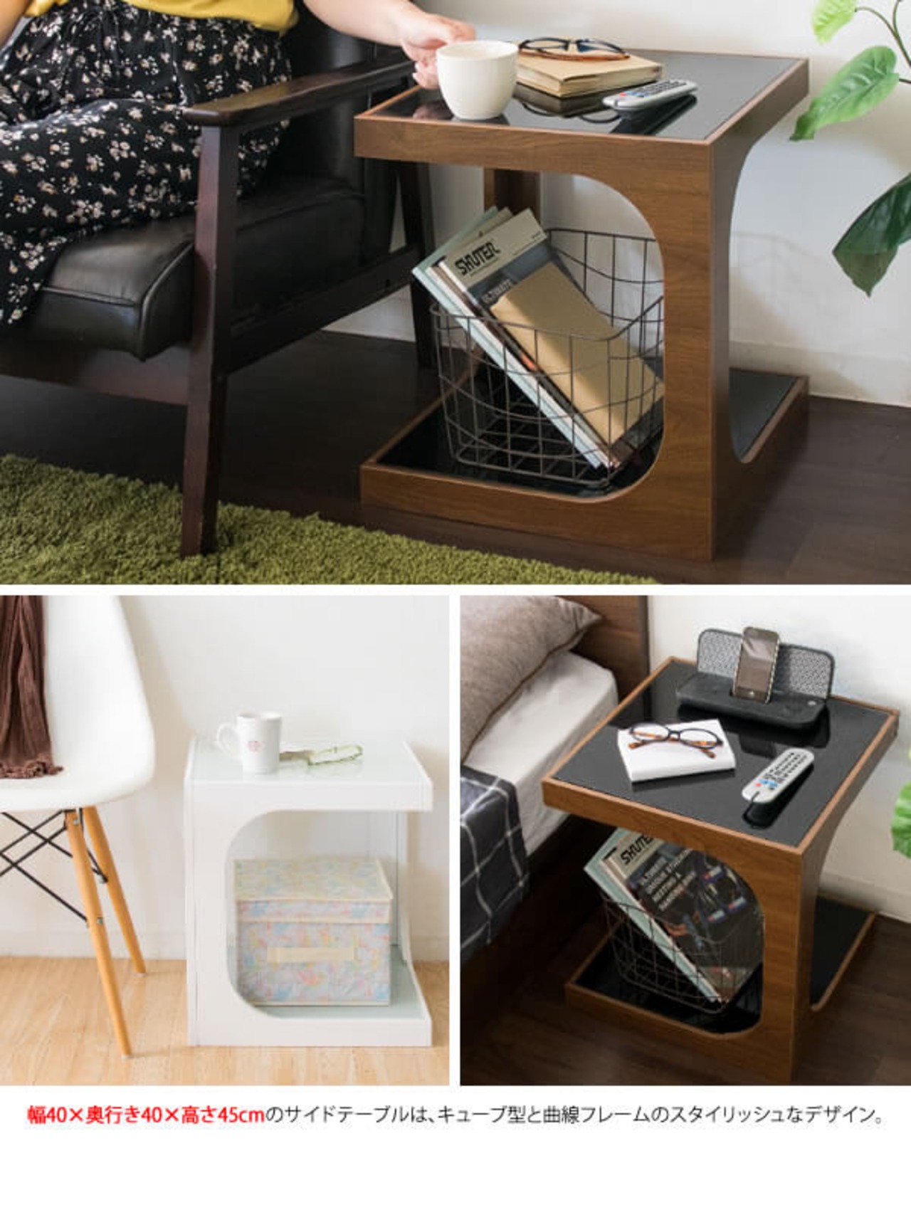 サイドテーブル 40cm幅 ブラウン ホワイト 茶色 白 ガラステーブル ソファサイドベッドサイド ナイトテーブル オープン収納付き 幅40cm 奥行40cm 高さ45cm おすすめ おしゃれ 北欧 モダン スタイリッシュ 机 ガラストップテーブル ガラス天板 正方形 収納付き机 春 夏 秋 冬