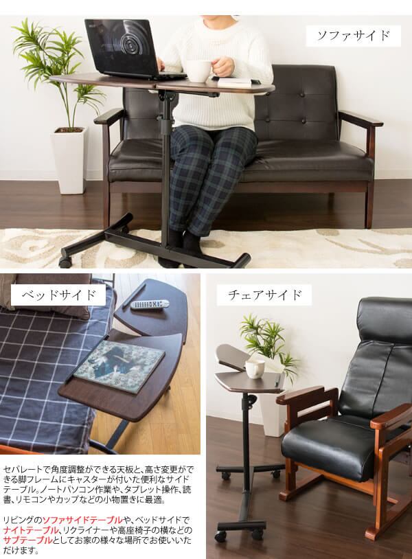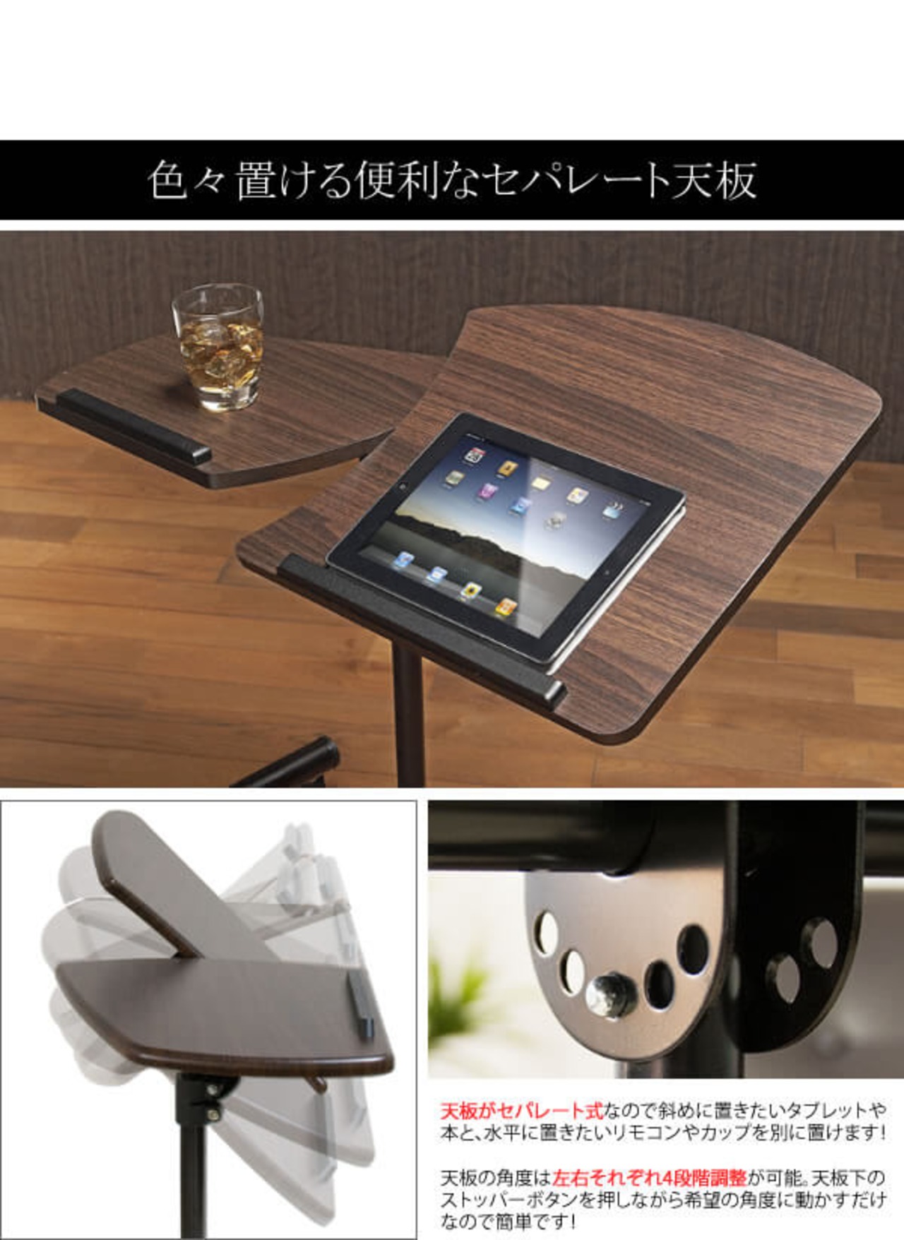 天板が左右に分かれているので片側は水平にしてコーヒーなど飲み物を、もう片側を斜めにしてタブレットテーブルにするなど使い分けが可能なサイドテーブルです。