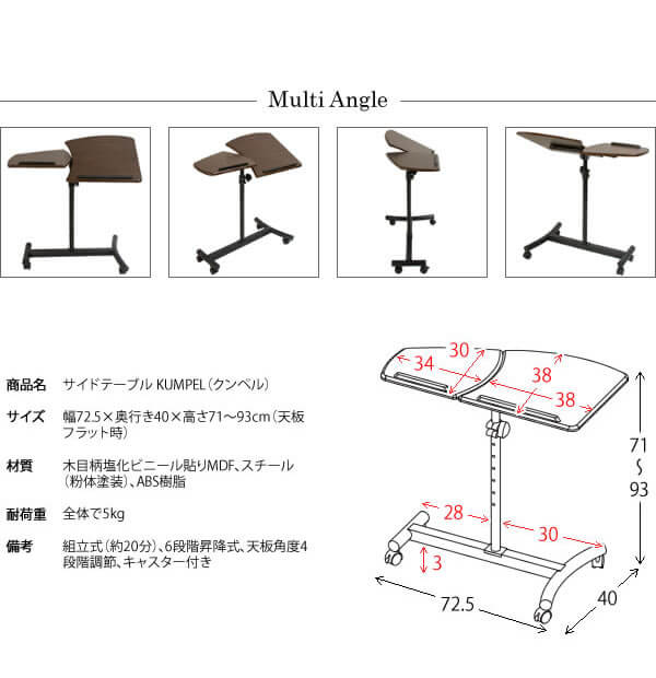 ■商品サイズ(約):幅72.5cm、奥行き40cm、高さ71cm〜高さ93cm(天板フラット時)