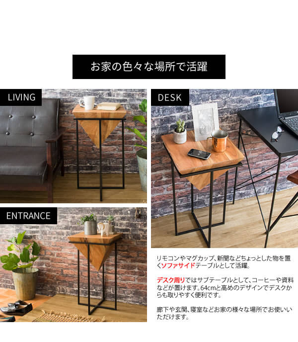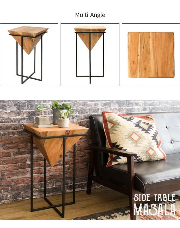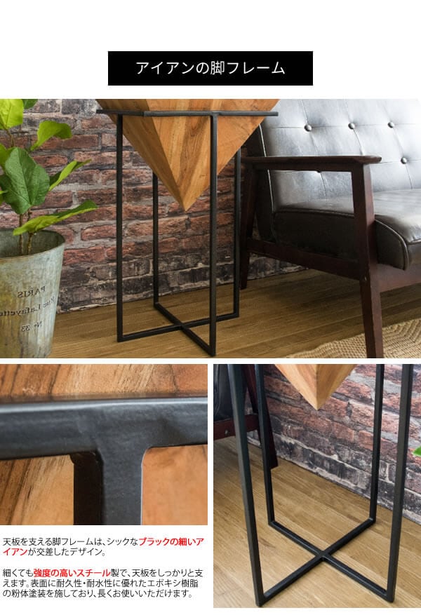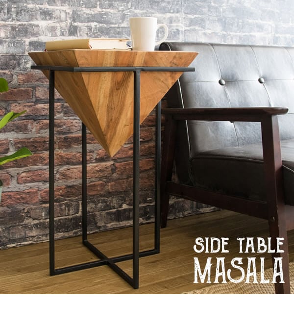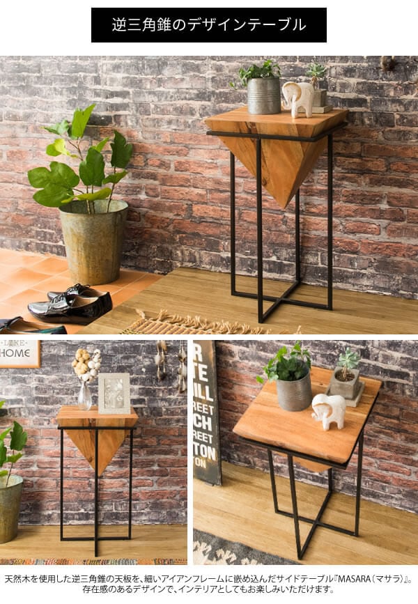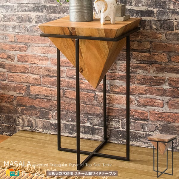 天然木を使用した逆三角錐の天板を、細いアイアンフレームに嵌め込んだサイドテーブルです。