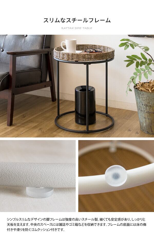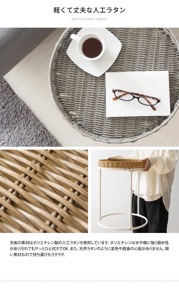 丁寧に編まれた丈夫な人工ラタンを天板に使用したラウンド型のサイドテーブルです。