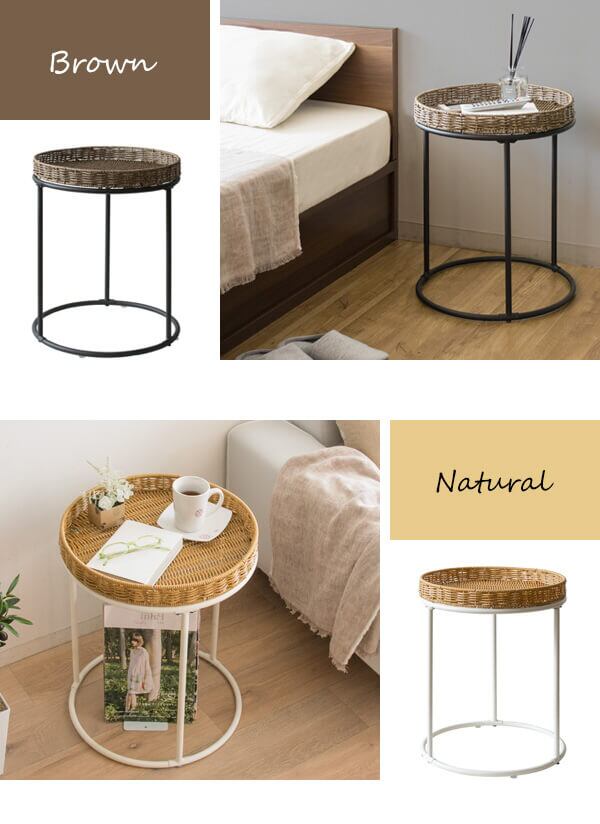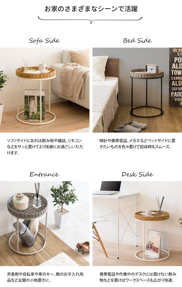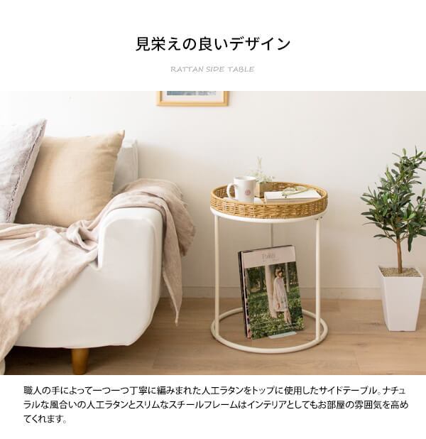 軽量で持ち運びがしやすく、ソファサイドやベッドサイドで本などを置くのに便利な天板に人工ラタンを使用したサイドテーブルです。