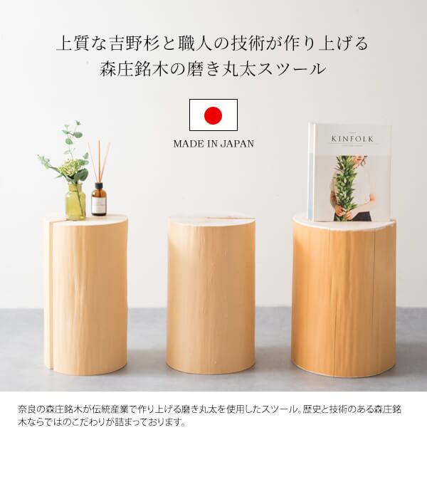 吉野の豊かな森から間伐された杉を、奈良の冬の伝統工芸磨き丸太に仕上げた多目的丸太スツールです。