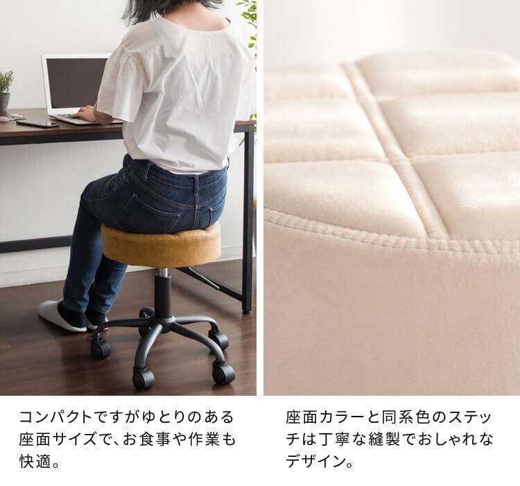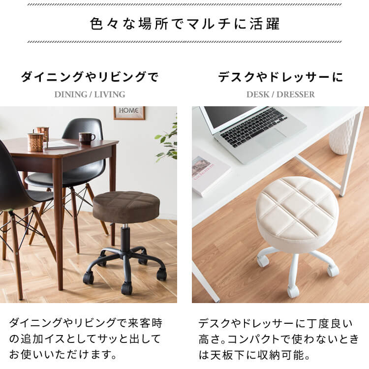 簡単昇降機能やキャスター付きで機能性、デザイン性にもこだわったキャスター付きスツールです。