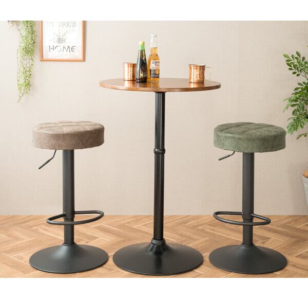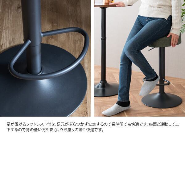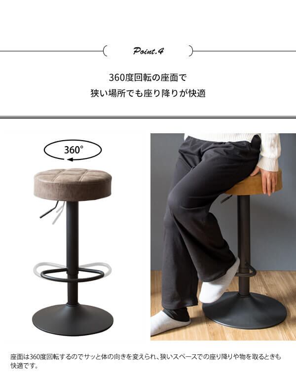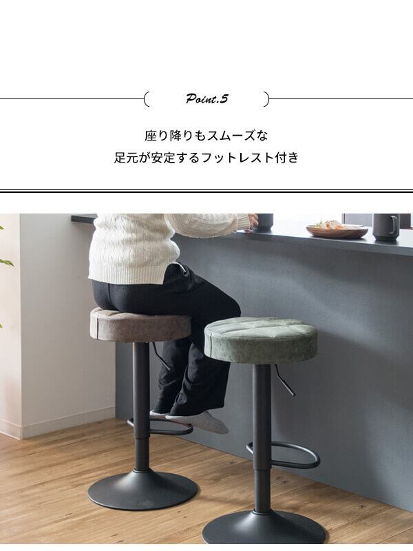 360度どこからでも座れるラウンドデザインと、クッション性に優れた座り心地、簡単昇降機能とフットレスト付き、など機能性、デザイン性にも優れたバースツールです。