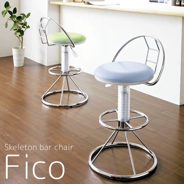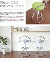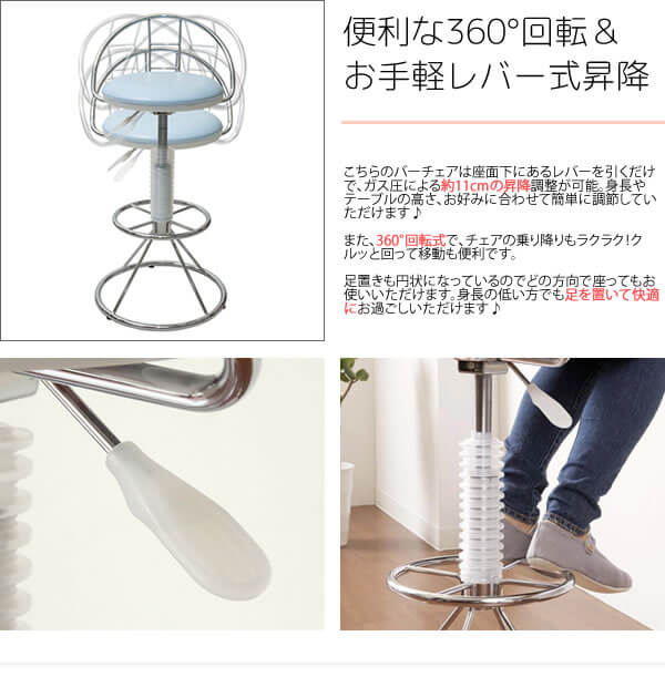 360度回転、レバー式昇降、背もたれと足置き付きの付いたバーチェアです。