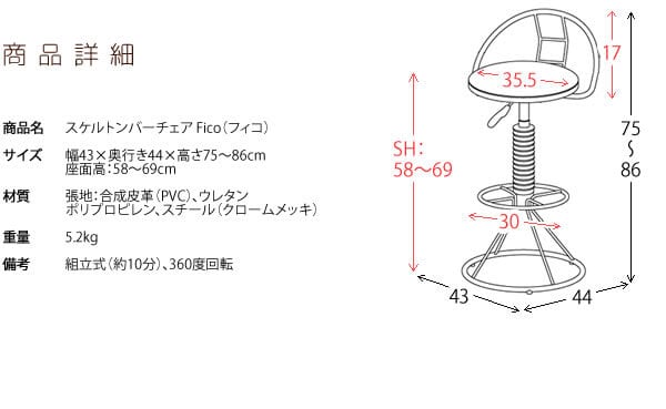 ■商品サイズ(約):幅43cm、奥行き44cm、高さ75cm〜高さ86cm、座面高58cm〜座面高69cm