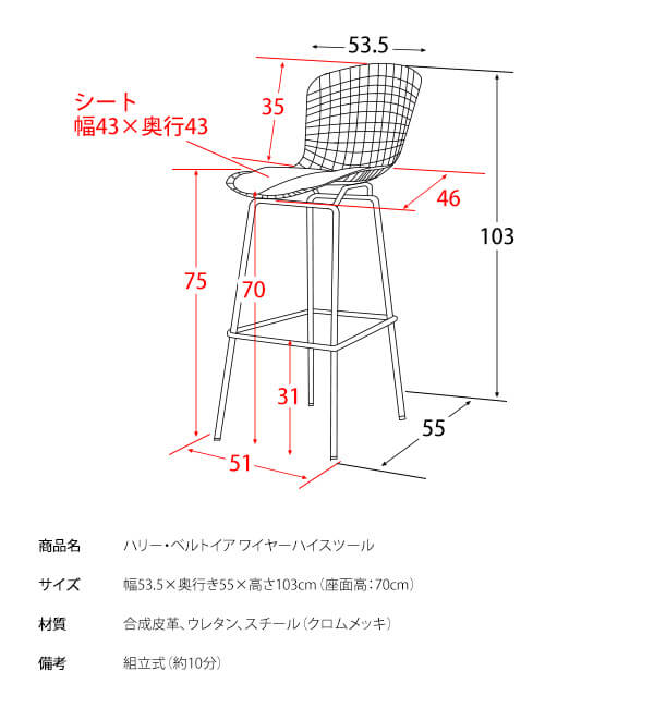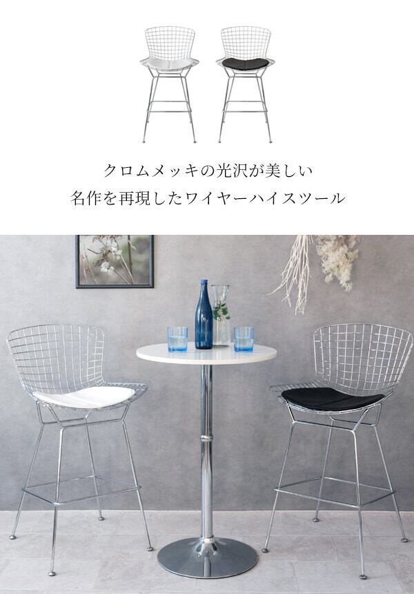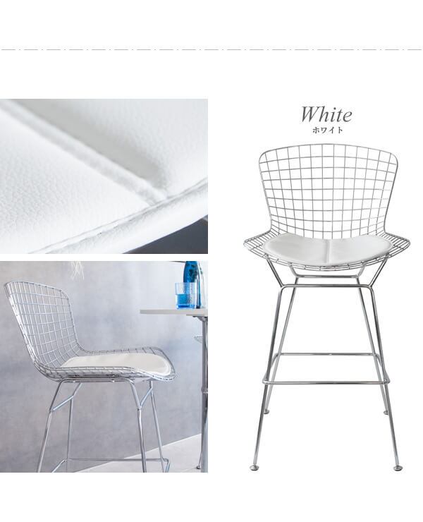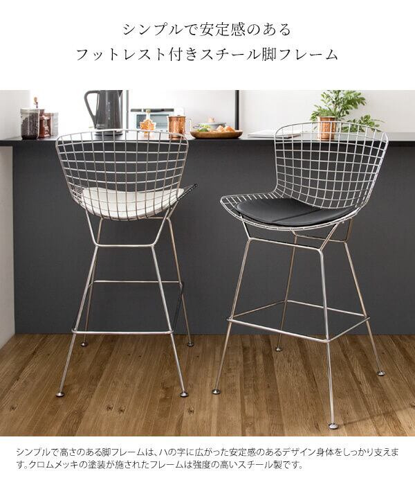 バーチェア 53.5cm幅 ブラック ホワイト 黒 白 ワイヤーハイチェア ハリーベルトイア リプロダクト 幅53.5cm 奥行55cm 高さ103cm 座面高70cm おすすめ おしゃれ 北欧 モダン スタイリッシュ スチールフレーム 合皮チェア 合皮の椅子 背もたれ付き 春 夏 秋 冬 椅子 チェアー