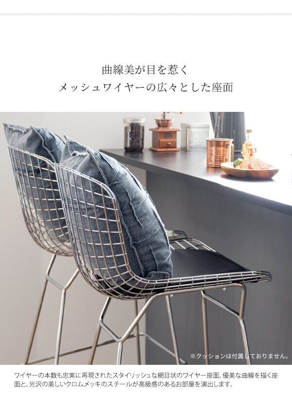 スチールのワイヤーが網目状に構成された背もたれは軽量かつ耐久性に優れており、座面高70cmとカウンターやバーテーブルに最適なバーチェア1脚単品です。