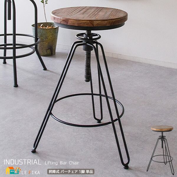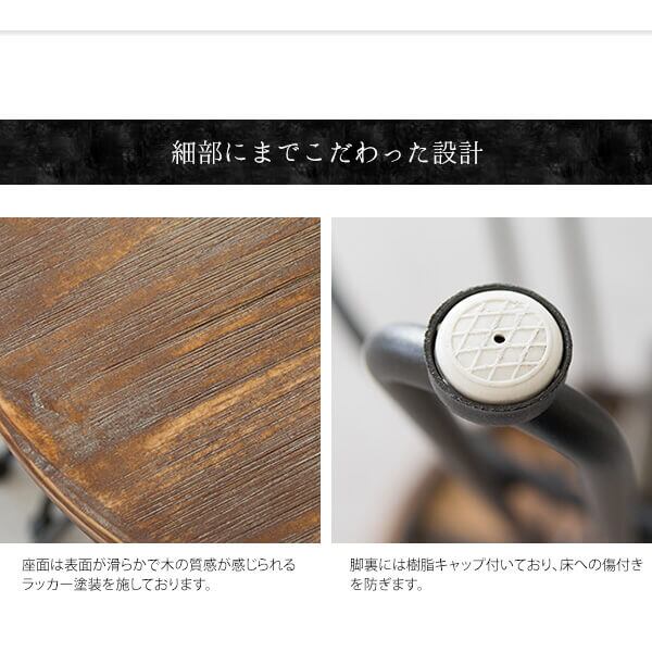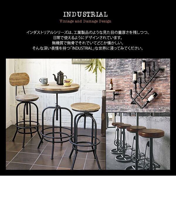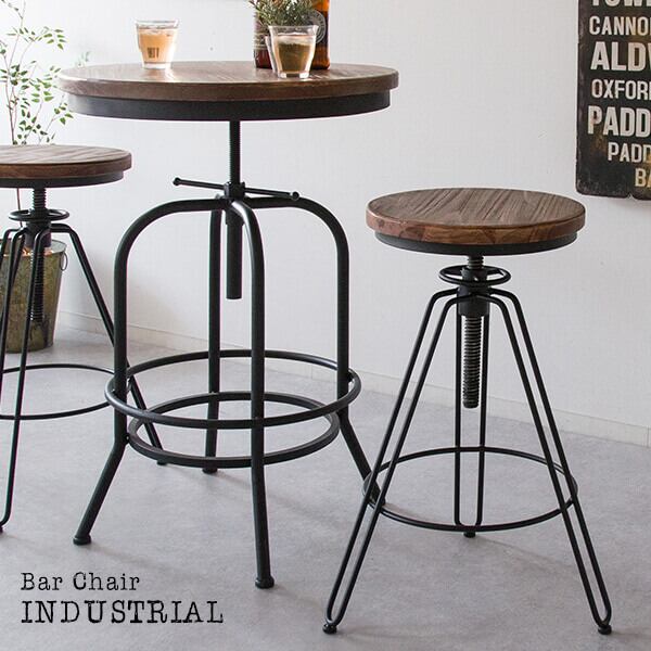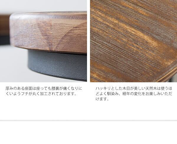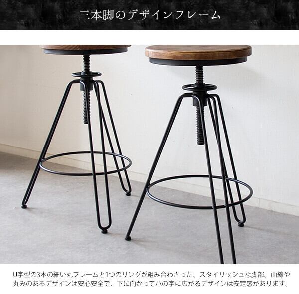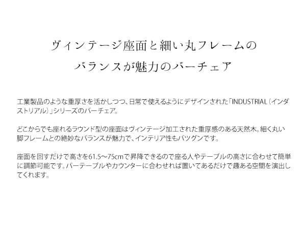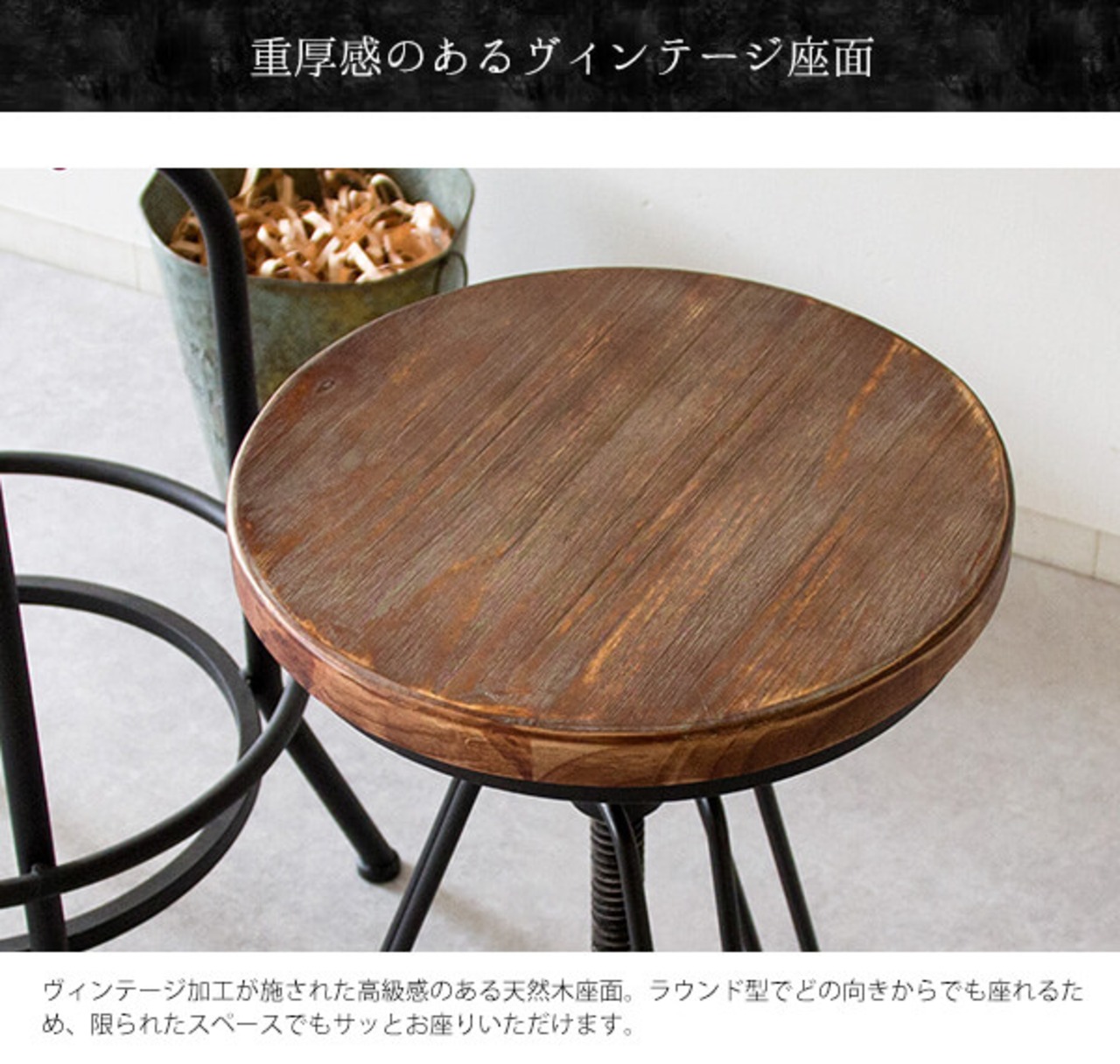 どこからでも座れるラウンド型の座面はヴィンテージ加工された重厚感のある天然木を使用しており、細く丸い脚フレームとの絶妙なバランスが魅力のおしゃれなバースツールです。