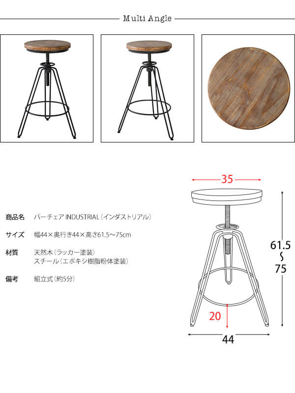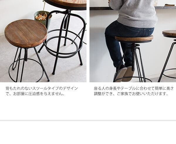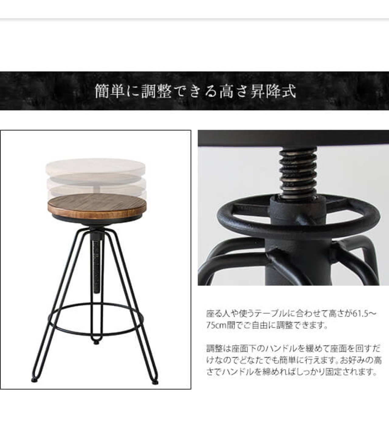 座面を回すだけで高さ61.5cm〜高さ75cmで昇降できるので座る人やテーブルの高さに合わせて簡単に調節可能なバースツールです。
