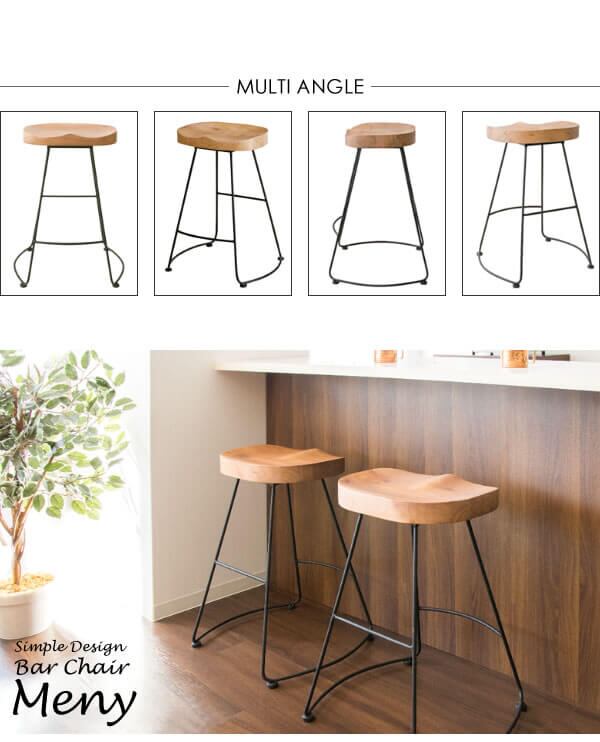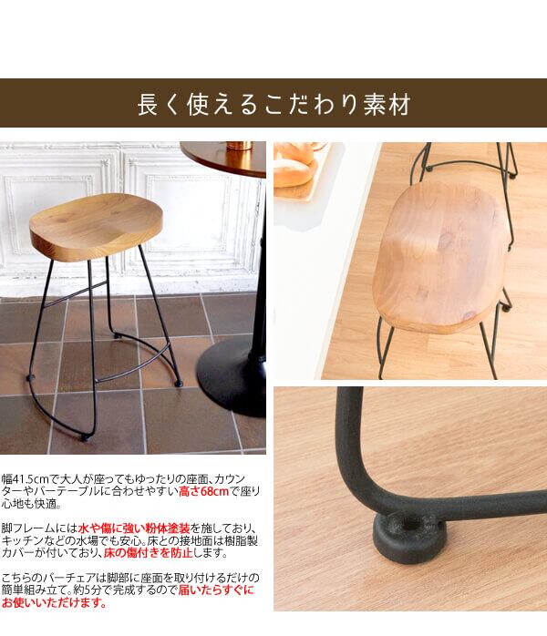 お尻にフィットする形状になった天然木座面と、細いアイアンフレームが特徴のシンプルデザインなバーチェアです。