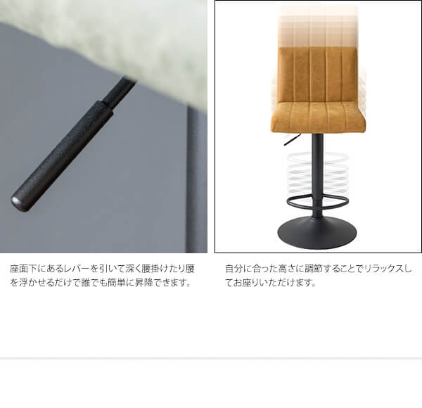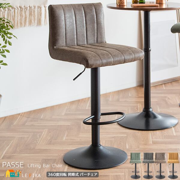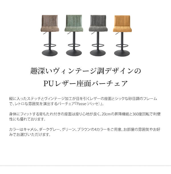 バーチェア 41cm幅 キャメル ダークグレー グリーン ブラウン ハイチェア 昇降式チェア 360度回転 昇降チェアー 合皮チェア 合成皮革 PUレザー 幅41cm 奥行44cm 高さ90cm 最大高さ110cm 座面高63cm 最大座面高83cm おすすめ おしゃれ 北欧 モダン 椅子 チェアー 春 夏 秋 冬