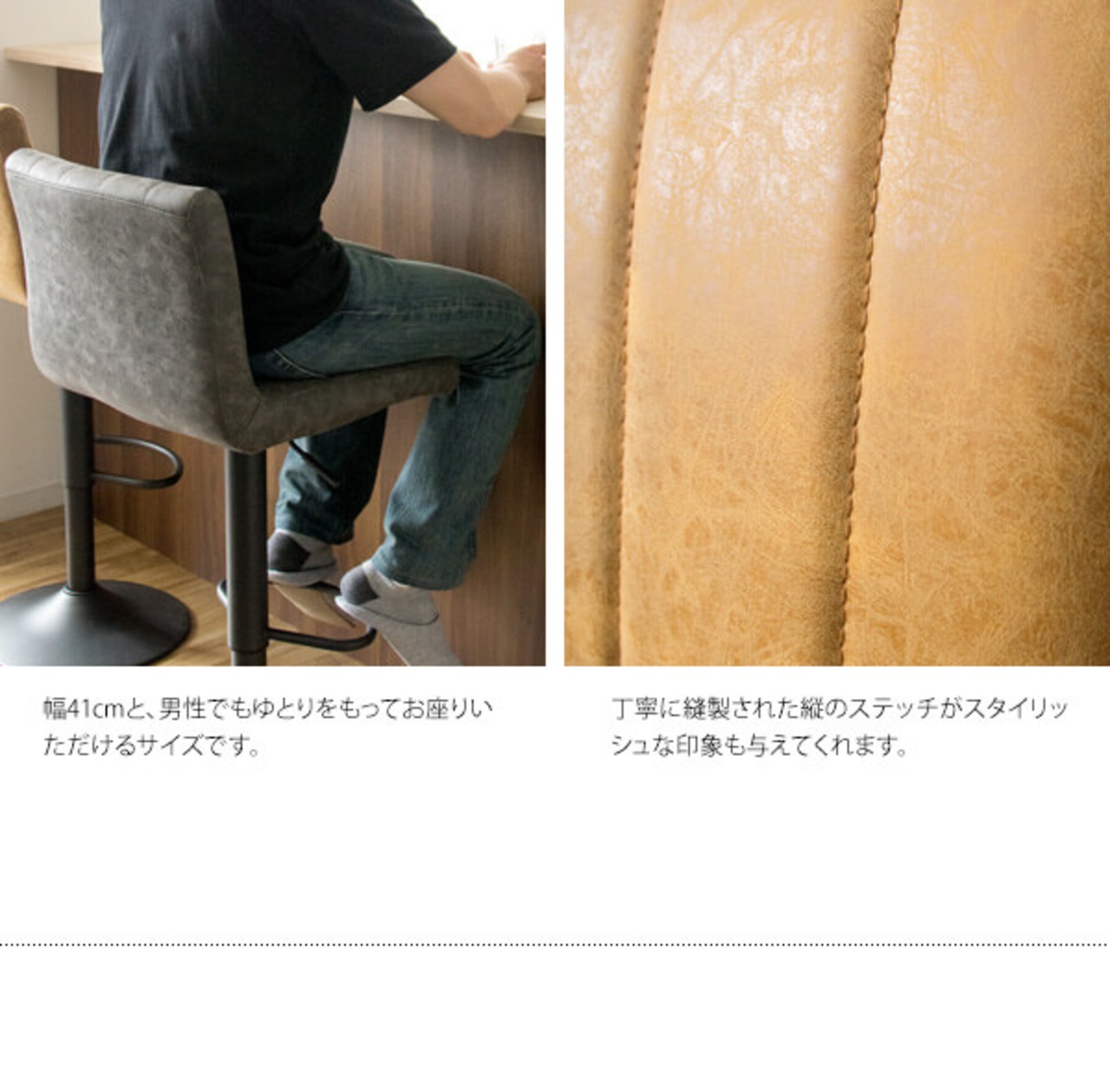 縦に入ったステッチとヴィンテージ加工のレザーの座面が目を引くバーチェア1脚単品です。