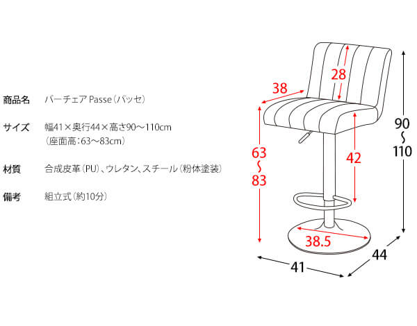 ■商品サイズ(約):幅41cm、奥行44cm、高さ90cm〜高さ110cm、座面高63cm〜座面高83cm