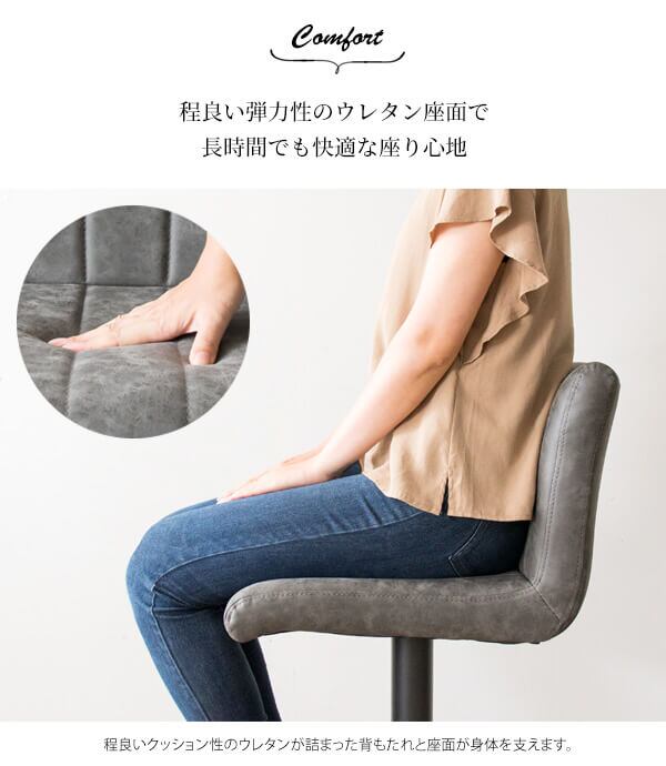 身体にフィットする背もたれ付きの座面は座り心地が良く、20cmの昇降機能と360度回転で利便性にも優れているバーチェアです。