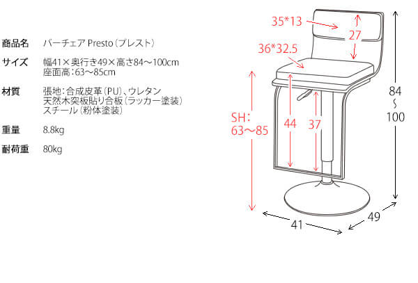 ■商品サイズ(約):幅41cm、奥行き49cm、高さ84cm〜高さ100cm、座面高63cm〜座面高85cm