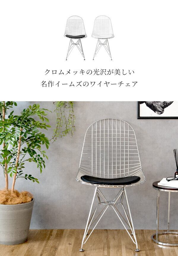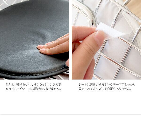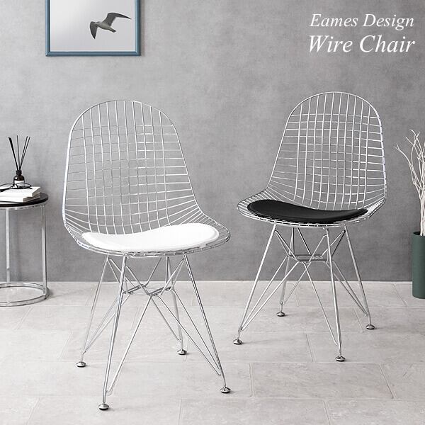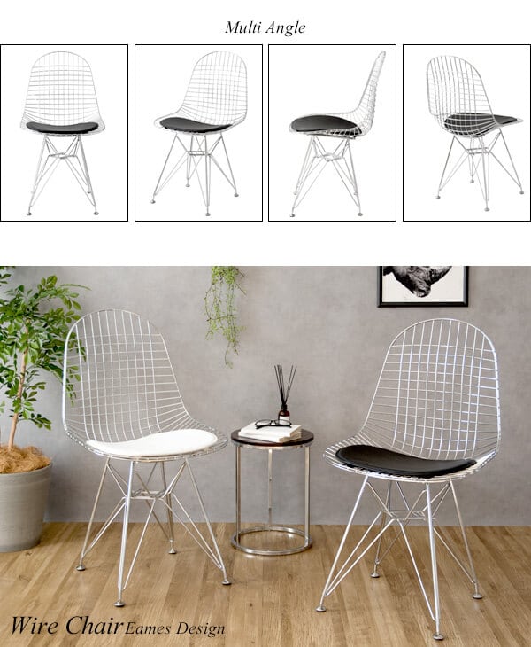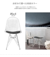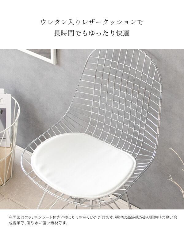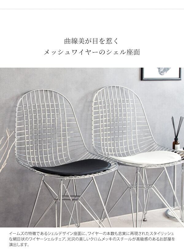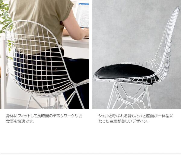 身体を包み込むシェルデザインの座面は、スチールのワイヤーが網目状に構成されており耐久性に優れており、座面クッションはお尻が痛くなりにくいウレタン入りのワイヤーチェアです。