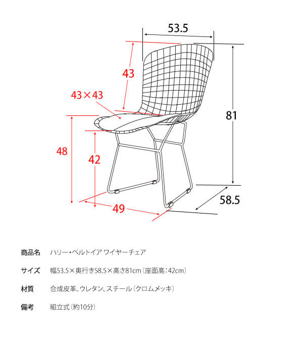 ワイヤーチェア 1脚 単品 53.5cm幅 ブラック ホワイト 黒 白 ワークチェア ハリーベルトイア リプロダクト 合皮チェア スチールフレーム 幅53.5cm 奥行58.5cm 高さ81cm 座面高42cm おすすめ おしゃれ 北欧 モダン スタイリッシュ メッシュワイヤー 背もたれ付 椅子 チェアー