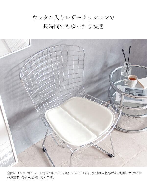 スチールのワイヤーが網目状に構成された背もたれは軽量かつ耐久性に優れており、座面はレザークッション付きでくつろげるデザインのワイヤーチェア1脚単品です。