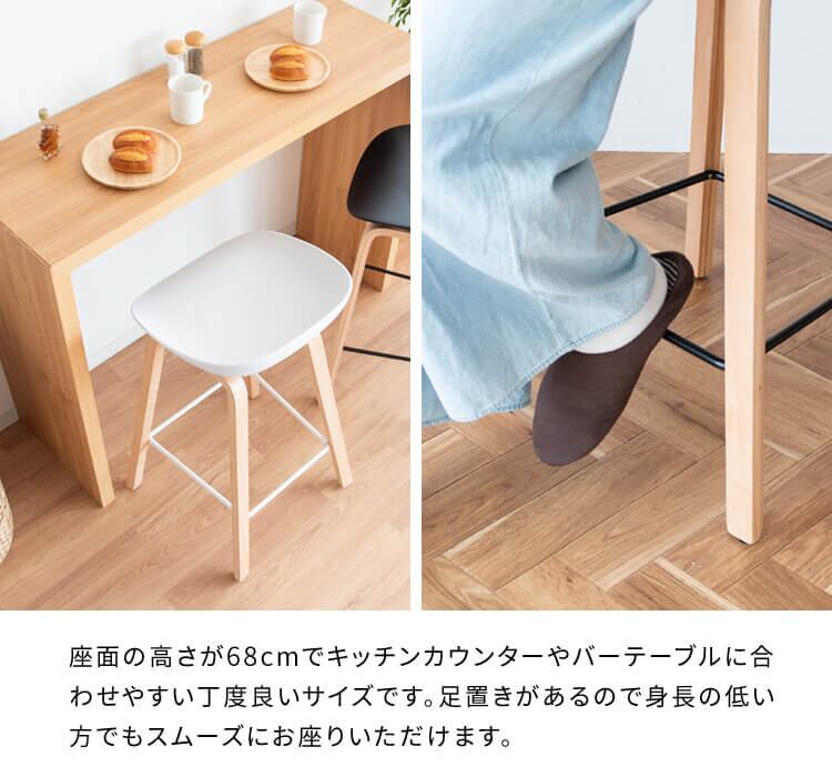 座面高さが(約)68cmで、キッチンカウンターやバーテーブルに合わせやすく、足置きがあるので身長の低い方でもスムーズに座って頂くことが可能です。