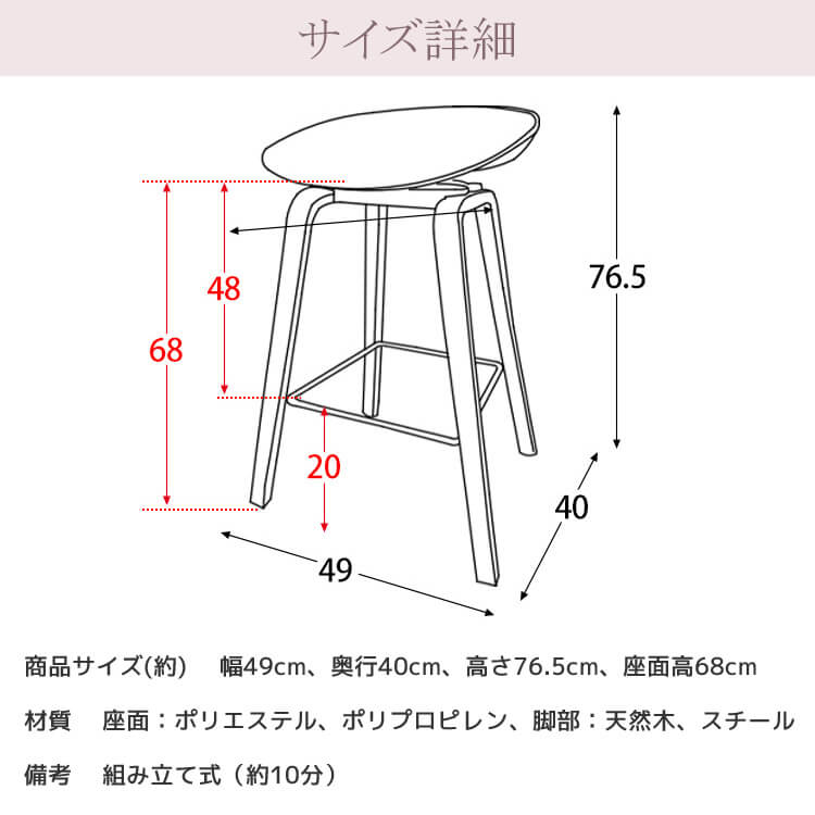 ■商品サイズ(約):幅49cm、奥行40cm、高さ76.5cm、座面高68cm