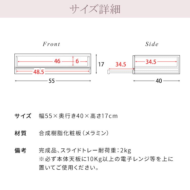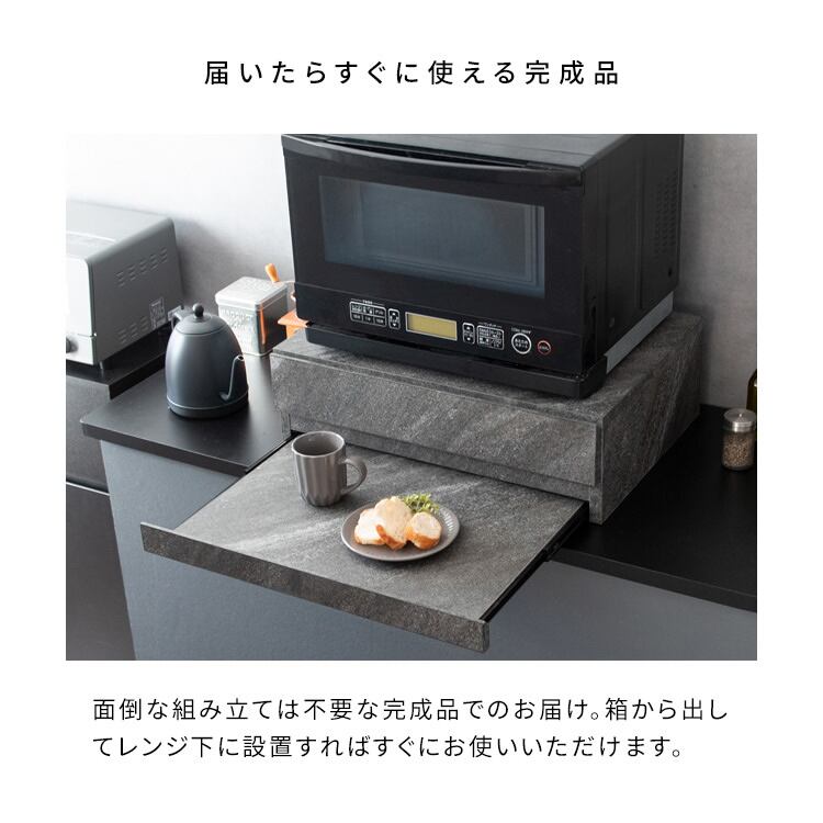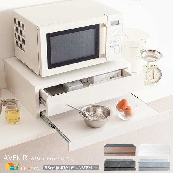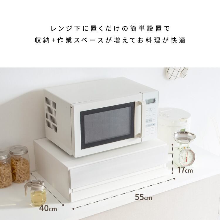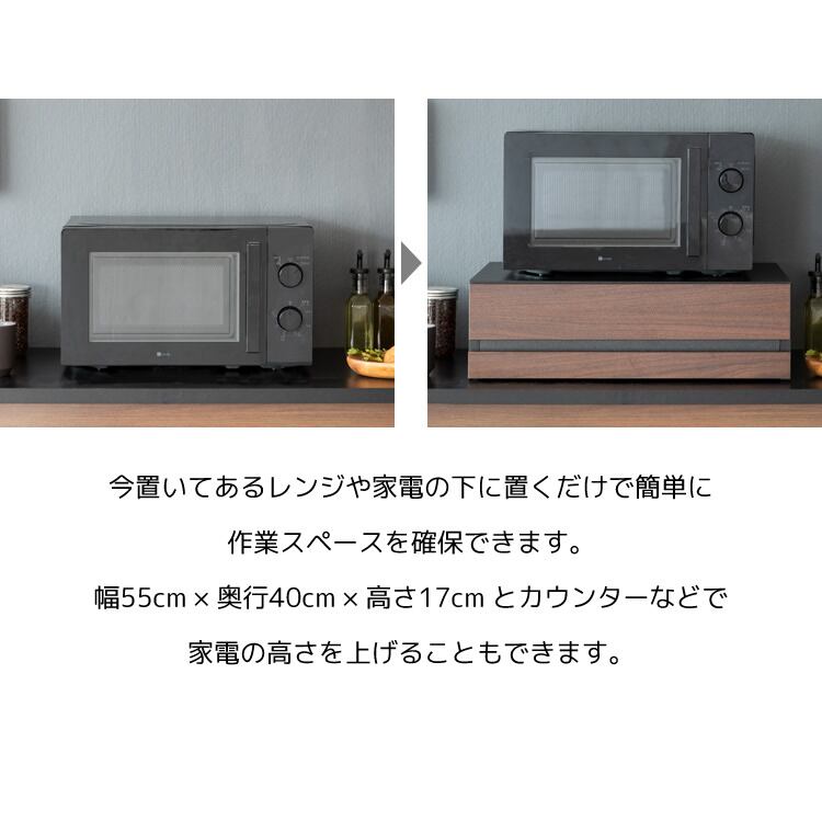 電子レンジや家電の下に置くだけで作業スペースを作ることができる55cm幅の収納付きレンジ下トレーです。