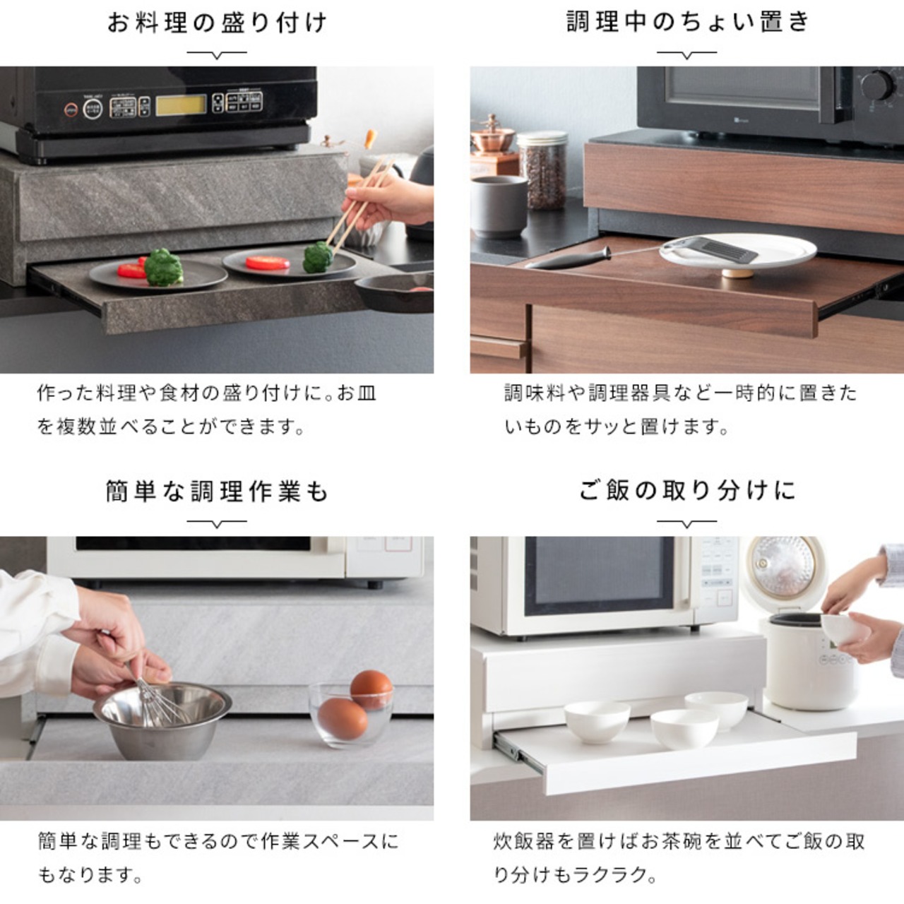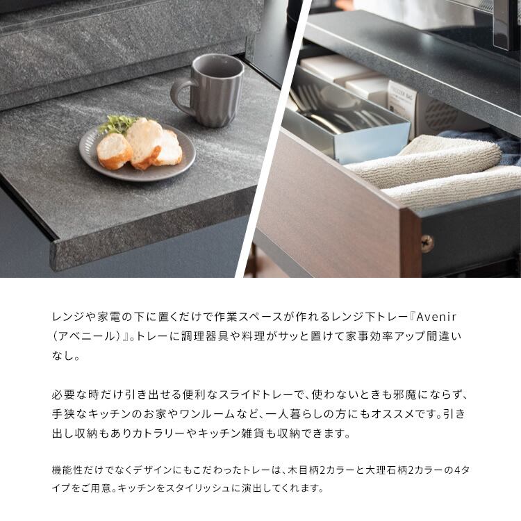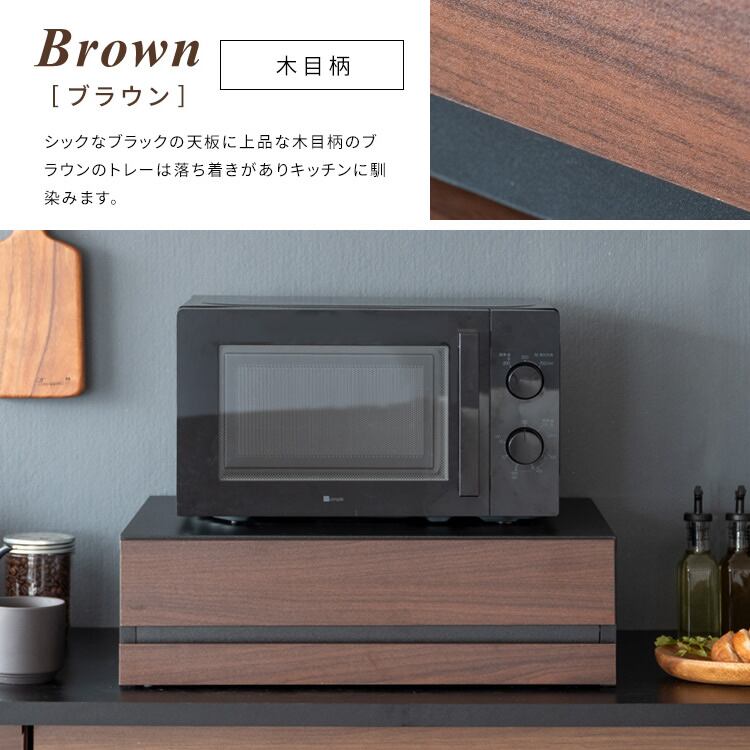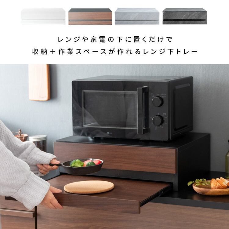 今置いてある電子レンジなどの下に置くだけで、お料理の盛り付けなどのちょい置きスペースとして、作業スペースを確保できる引き出し収納付きレンジ下トレーです。