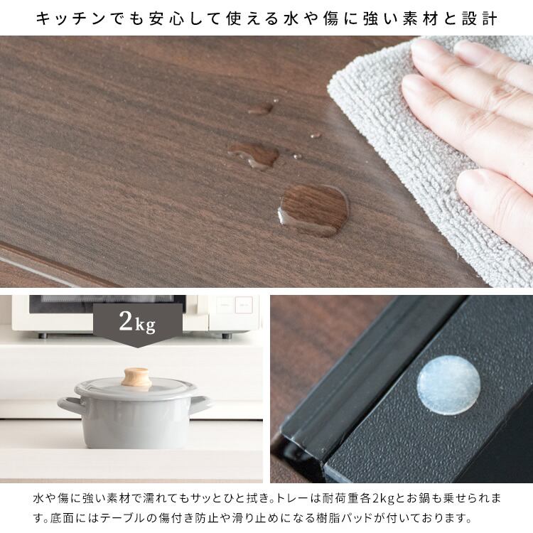 水や傷に強い素材で濡れてもサッとひと拭きでお手入れも簡単で、スライドトレーの耐荷重(約)2kgなので、お鍋も載せることができます。