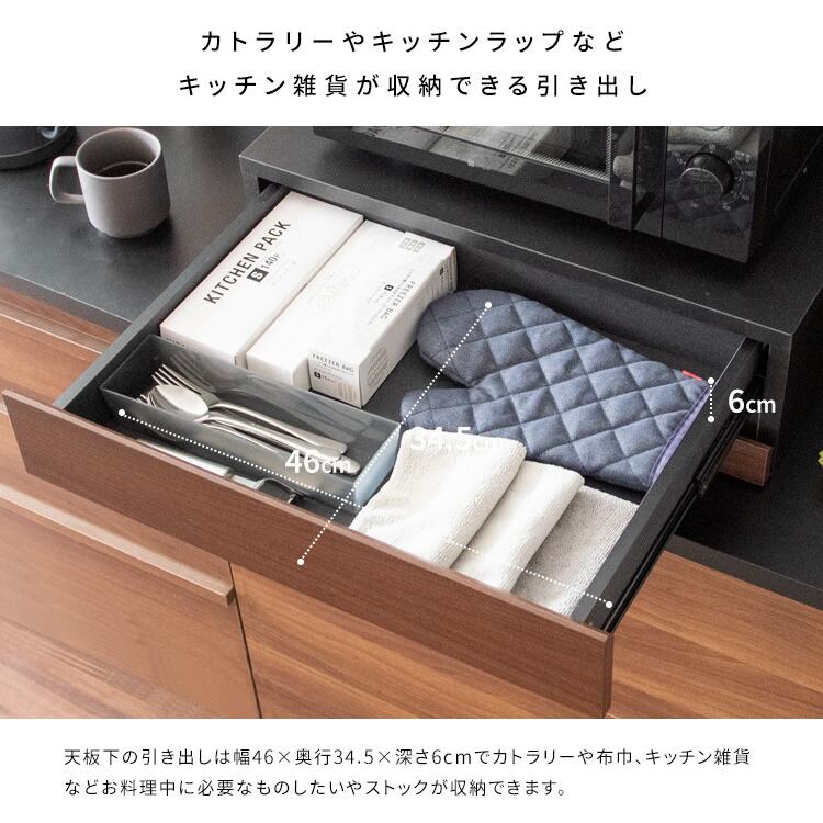 天板下は引き出し収納になっており、キッチンに置きたいカトラリーや布巾、キッチン雑貨などをまとめて収納できます。