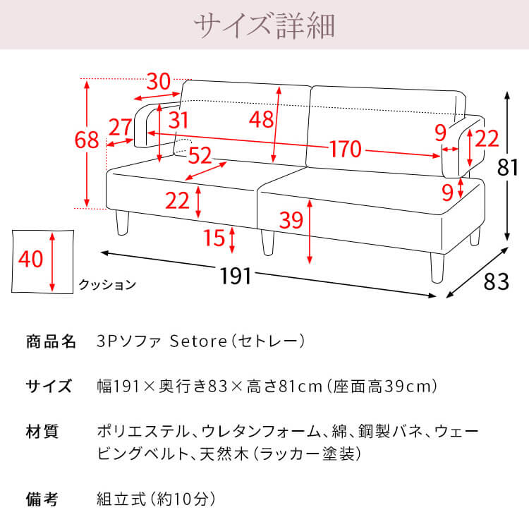 ■素材:ポリエステル、ウレタンフォーム、綿、鋼製バネ、ウェービングベルト、天然木(ラッカー塗装)