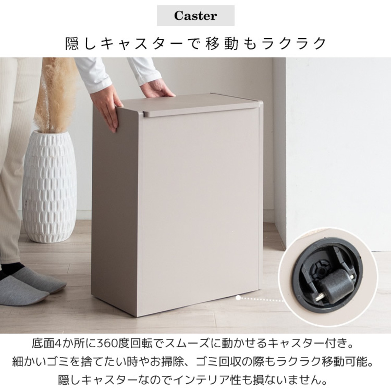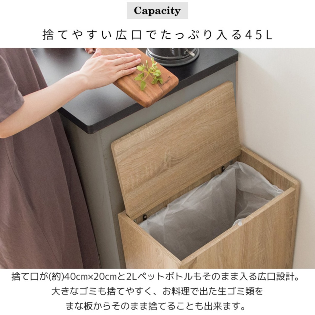 ゴミ箱だと分かりにくいスタイリッシュなデザインでキッチンに馴染み、たっぷり入る45Lで、ニオイ漏れを防ぐフタや移動がラクにできる隠しキャスター付きで利便性も抜群です。