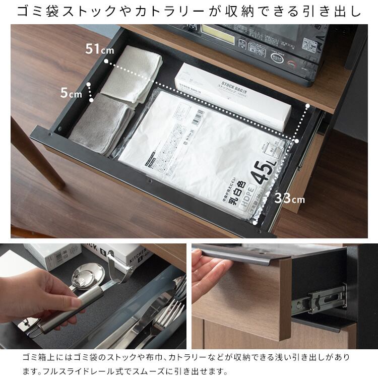 ゴミ箱上の引き出し収納にはゴミ袋のストックや布巾、カトラリーなどの収納におすすめです。