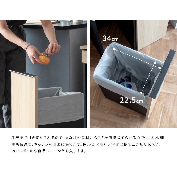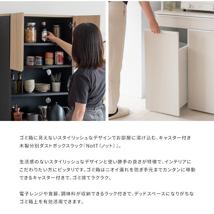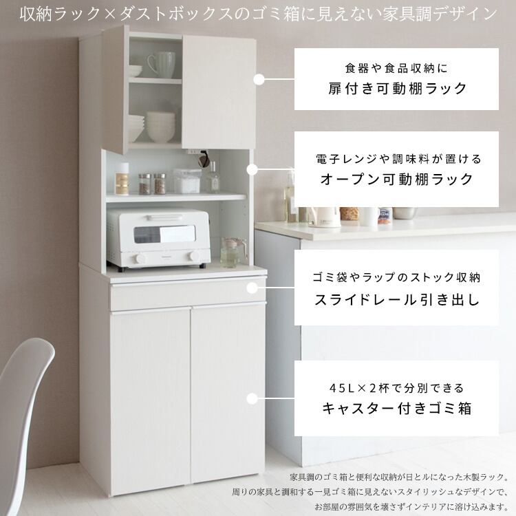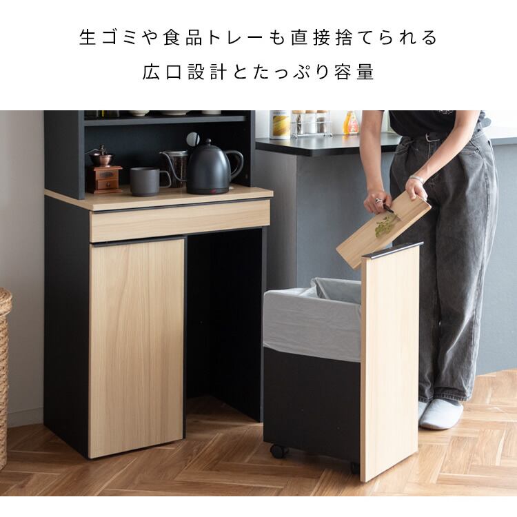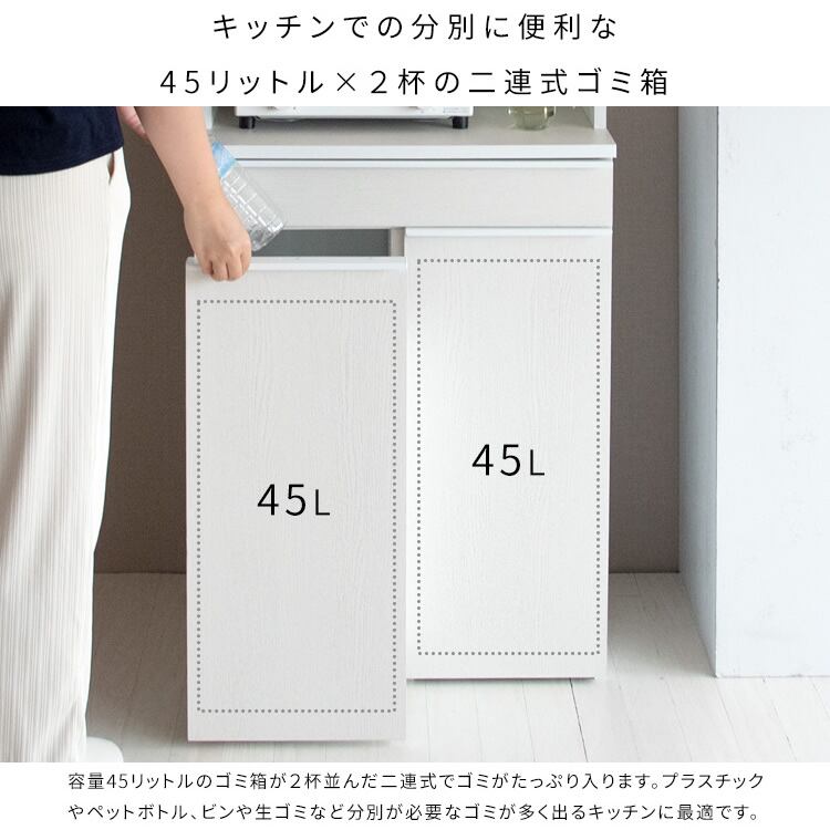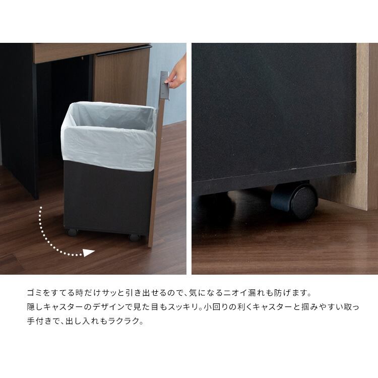ゴミ箱に見えないスタイリッシュなデザイン性と、45リットルのポリ袋対応のキャスター付きゴミ箱を2杯備えた、ゴミ箱上のデッドスペースを有効に活用できる機能性にもこだわったゴミ箱付きキッチンラックです。