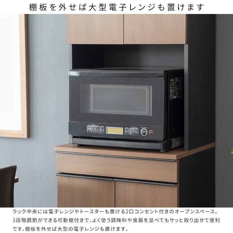 ラック中央には電子レンジやトースターも置くことができる2口コンセント付きのオープン収納するペースを確保しています。