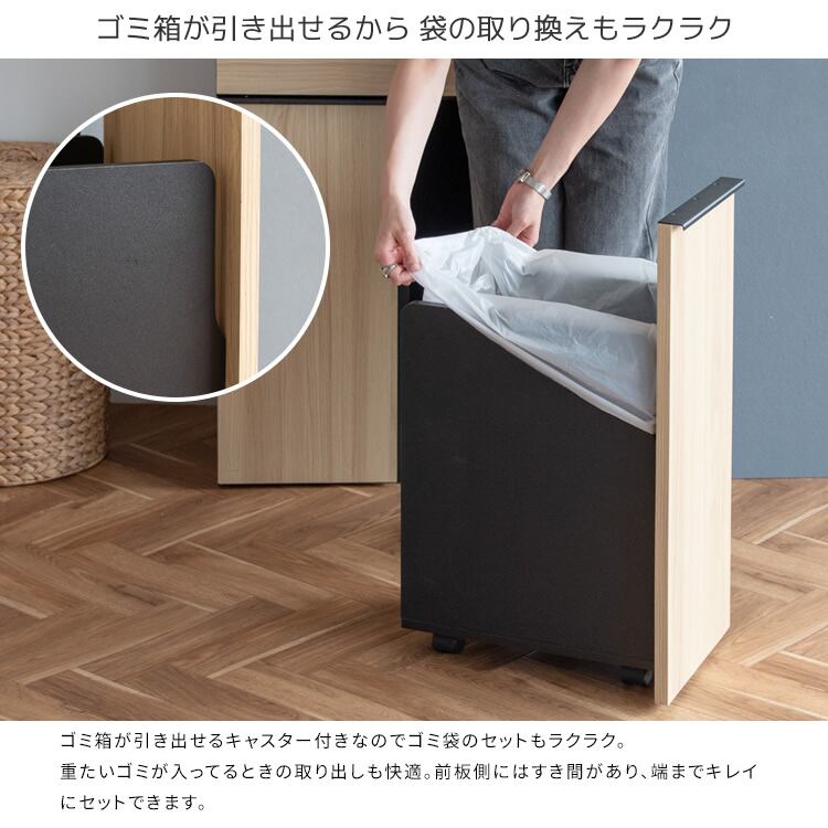 ゴミ箱には小回りの利くキャスターとつかみやすい取っ手付きで、出し入れも簡単です。