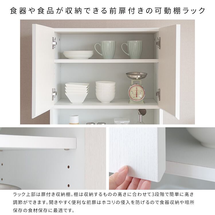 ラック上部には扉付き収納を備えており、収納する物に合わせて3段階の高さ調節が可能な可動棚仕様になっています。