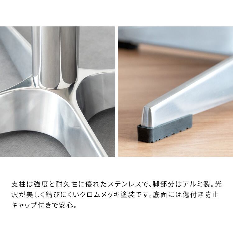 支柱には強度と耐久性に優れたステンレスを採用しており、脚部分はアルミ製、光沢が美しくさびにくいクロムメッキ塗装を施しています。