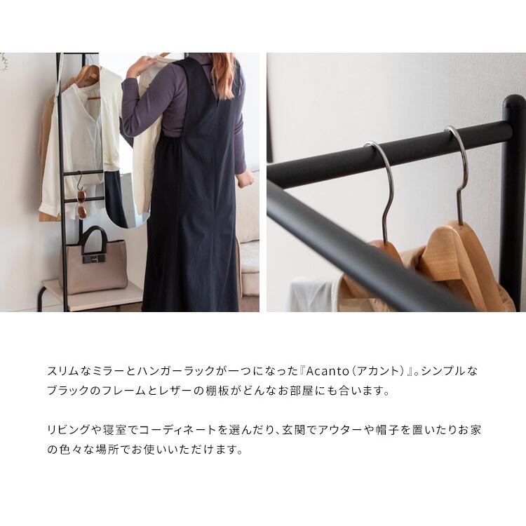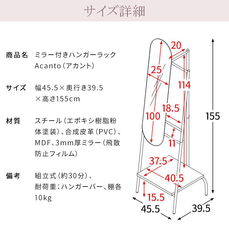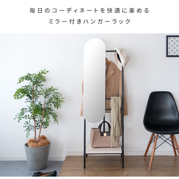 ミラー付きハンガーラック 45.5cm幅 鏡付きハンガーラック ハンガーラック 衣類ラック コートハンガー 衣類掛け 洋服掛け おすすめ おしゃれ 北欧 モダン スタイリッシュ 帽子掛け ストール掛け 収納棚付き 合皮 合成皮革 スチールフレーム 幅45.5cm 奥行39.5cm 高さ155cm