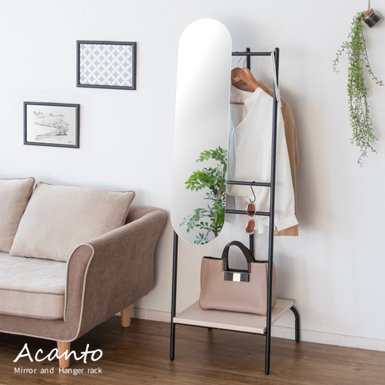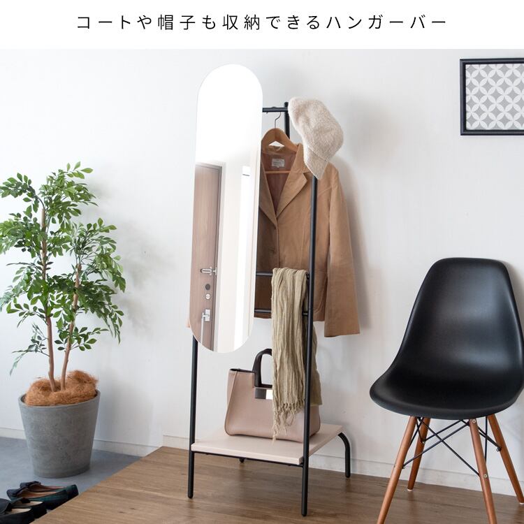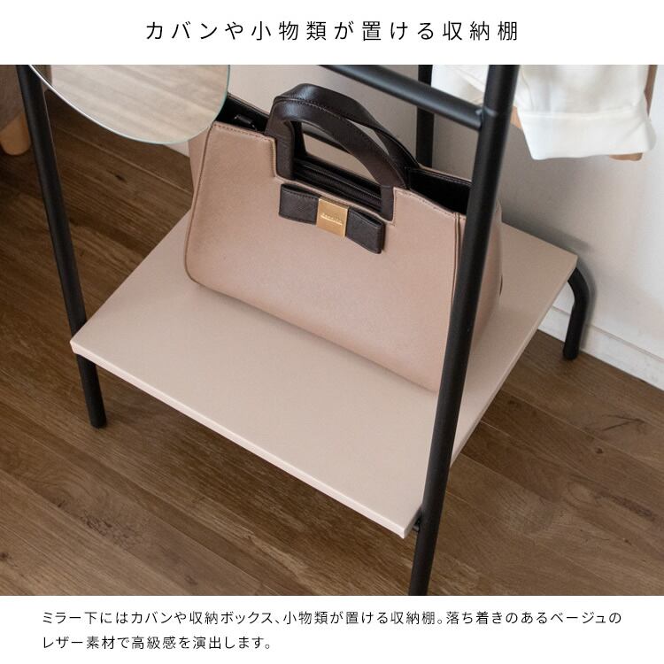 ミラー付きハンガーラック 45.5cm幅 ブラック 黒 ベージュ 鏡 ミラー付き ハンガーラック 洋服掛け 姿見 衣類掛け 帽子掛け マフラー掛け ストール掛け おすすめ おしゃれ 北欧 モダン スタイリッシュ 合成皮革 PVC 合皮 スチール リビング収納 玄関収納 ハンガーラック付きミラー 鏡付きハンガーラック