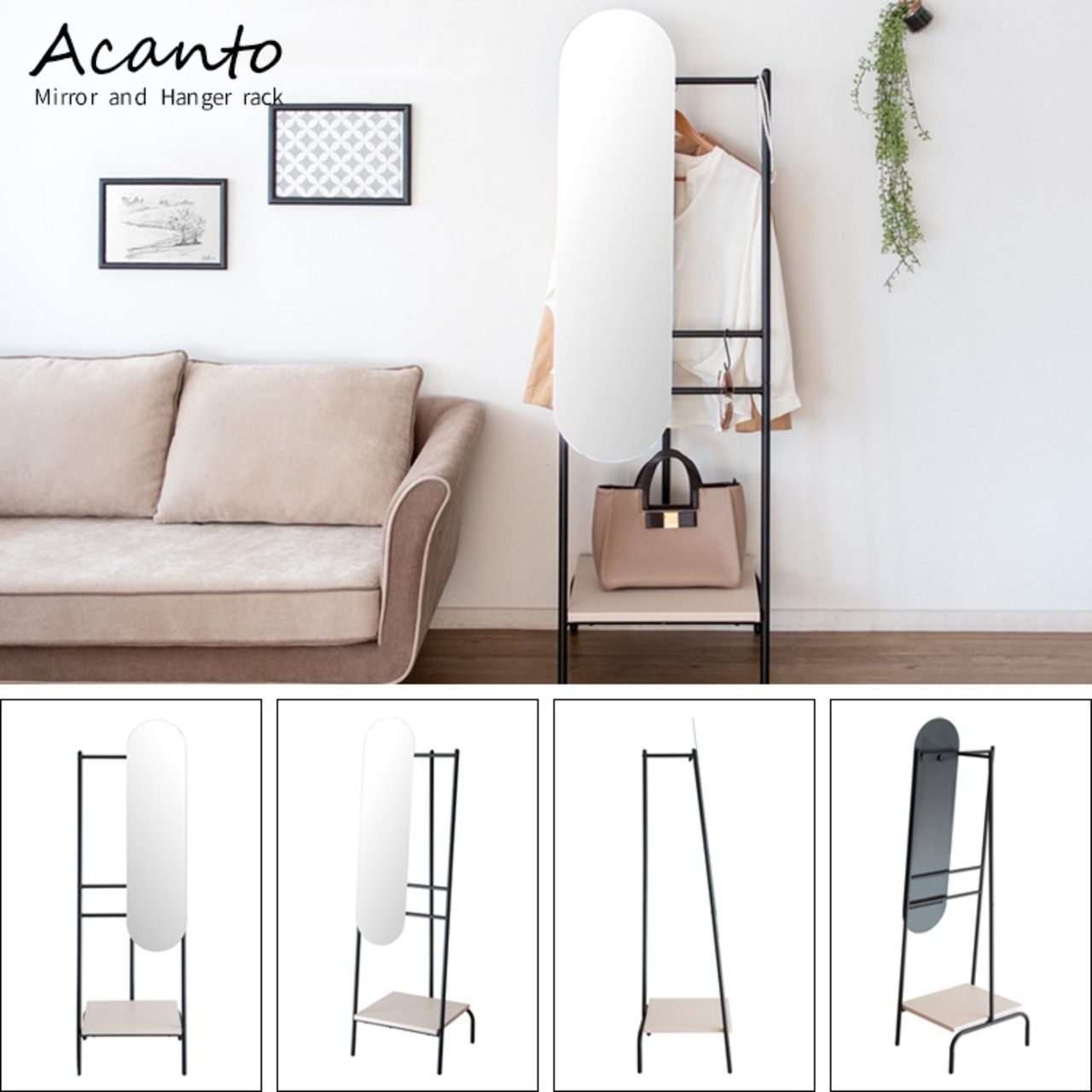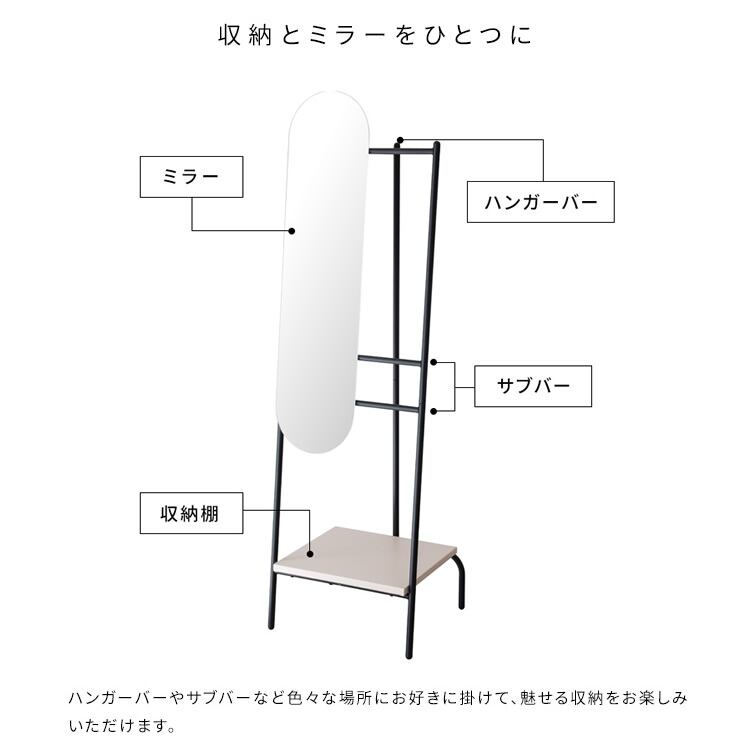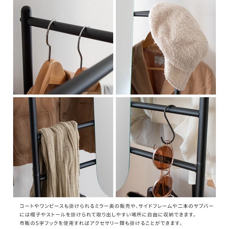 コートやワンピースなどの長物もかけられるミラー奥のハンガーバーや、サイドフレーム、2本のサブバーには帽子やストールを掛けられて取り出しやすい場所に自由に収納可能です。