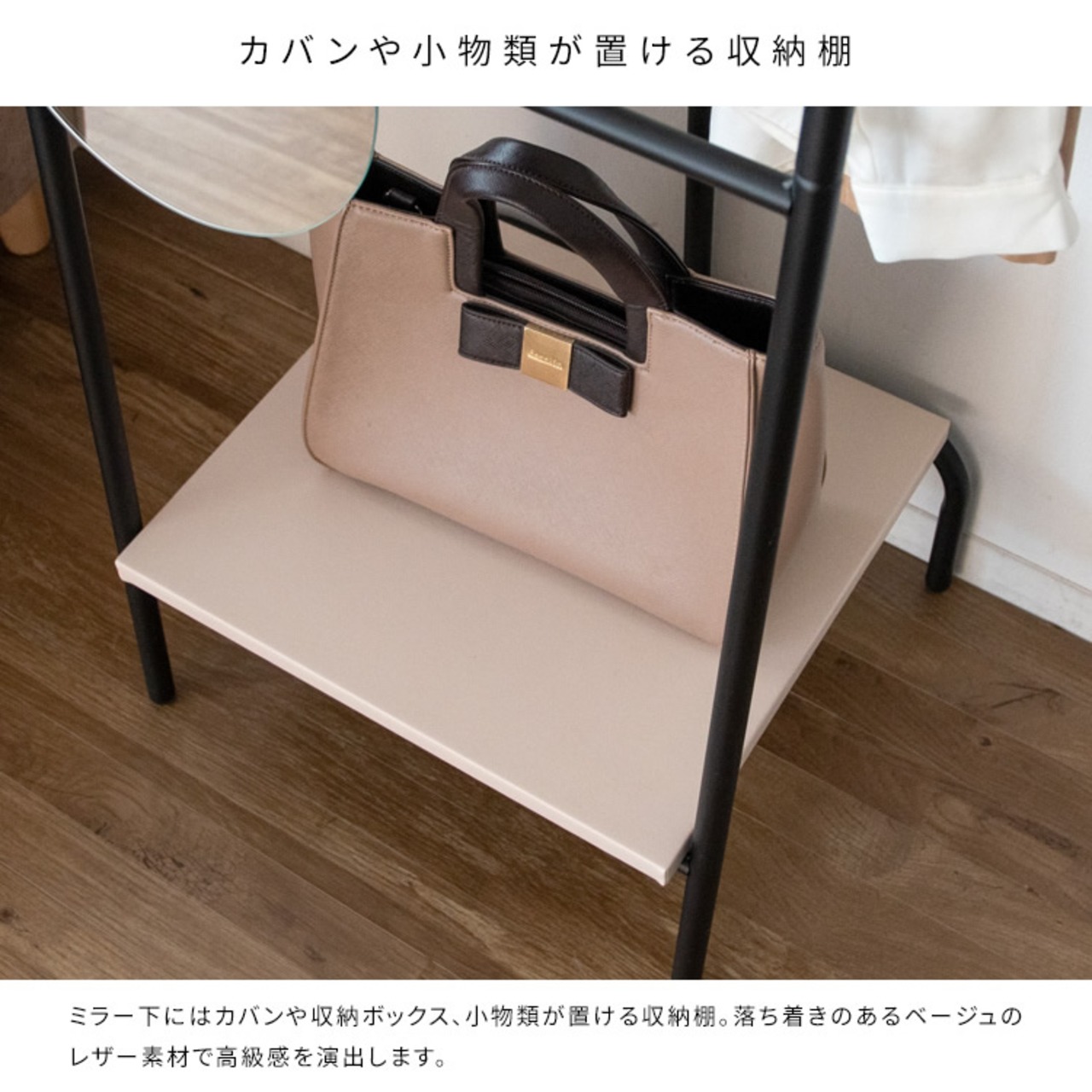 ミラー下にはカバンや収納ボックス、小物類を置くことができる収納棚付きです。
