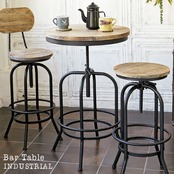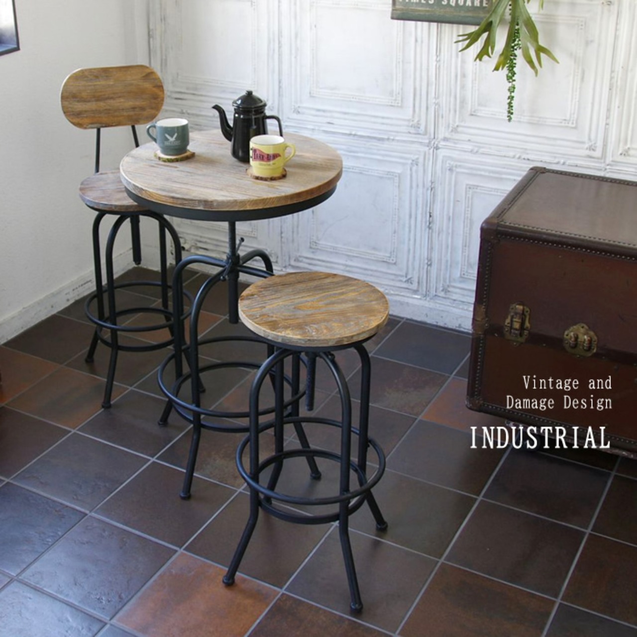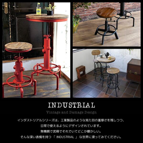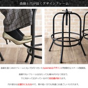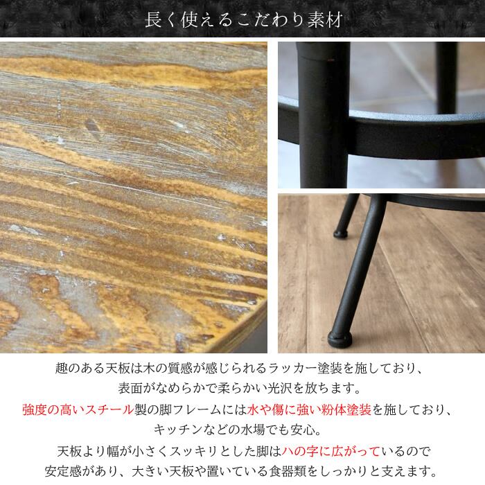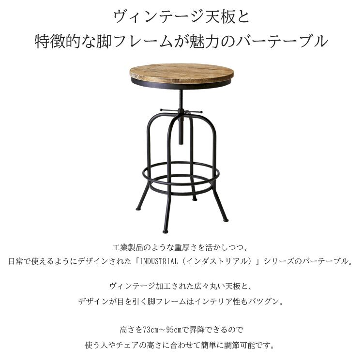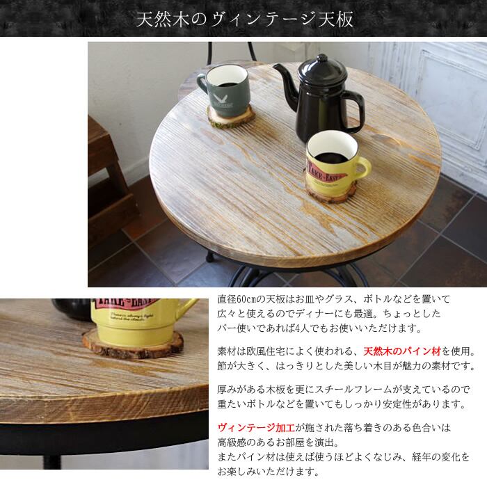 ヴィンテージ加工された広々丸い天板と、デザインが目を引く脚フレームが特徴的な60cm幅のバーテーブルです。