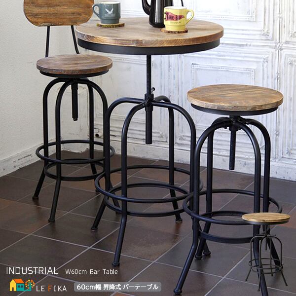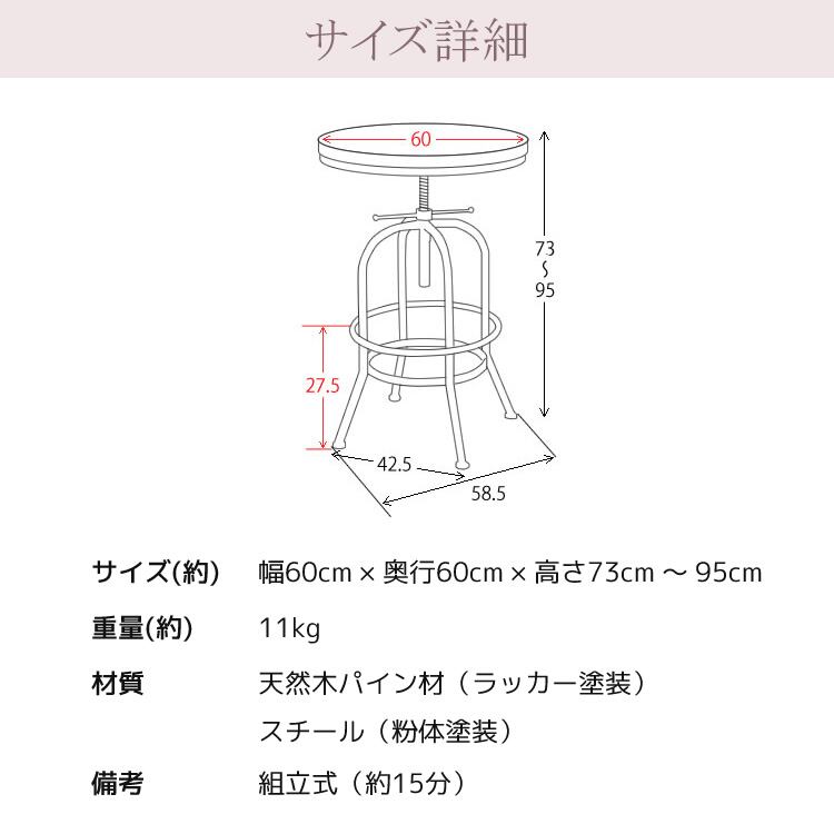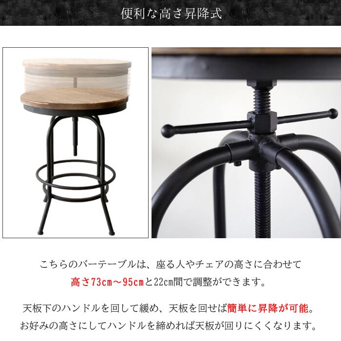 バーテーブル 1台 単品 60cm幅 ブラック 円型テーブル 丸型テーブル 円形テーブル 丸形テーブル 丸テーブル 丸机 おすすめ おしゃれ モダン ヴィンテージ調 昇降テーブル 高さ調整可能 幅60cm 奥行60cm 最大高さ95cm 天然木使用 パイン材 スチールフレーム 昇降式テーブル