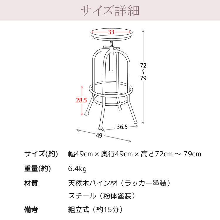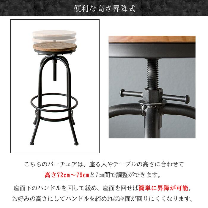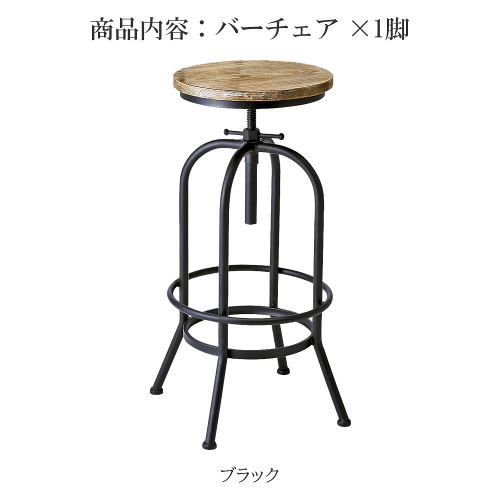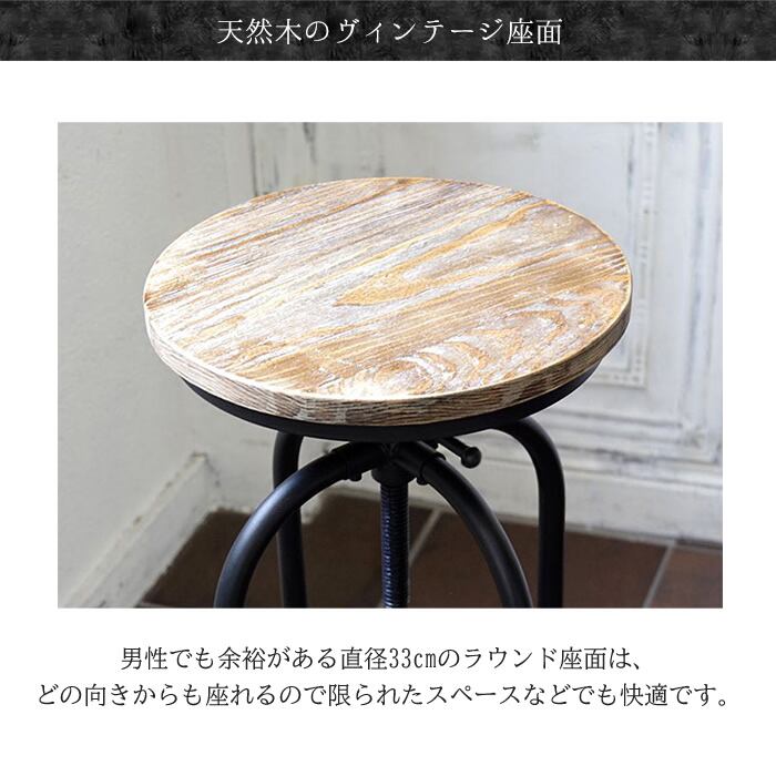 バーチェア 49cm幅 ブラック 丸型チェア 円型チェア 丸形チェア 円形チェア 丸椅子 丸チェア スツール 背もたれ無し 肘置き無し 肘掛け無し アームレスチェア おすすめ おしゃれ 北欧 モダン スタイリッシュ ヴィンテージ加工 ミッドセンチュリー 天然木 パイン材 スチールフレーム 円型座面 高さ調整可能 昇降チェア 昇降スツール バースツール 椅子 チェア