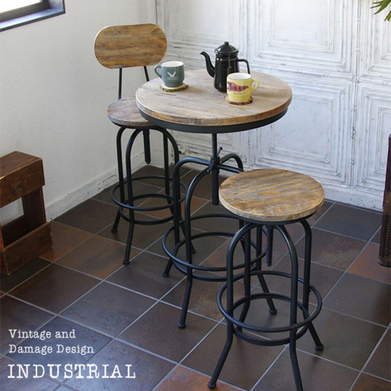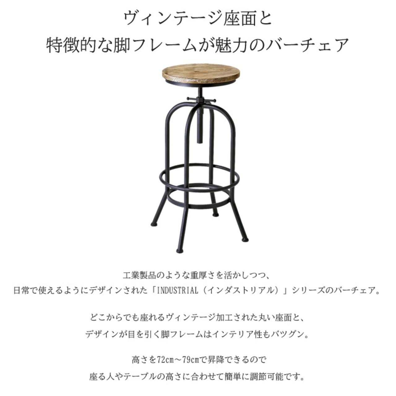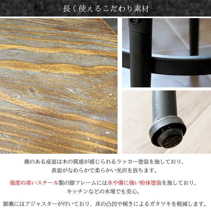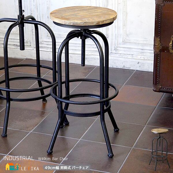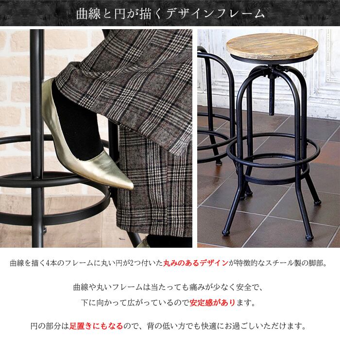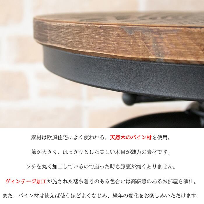 ヴィンテージ加工された丸い座面と、デザインが目を引く49cm幅のバーチェアです。