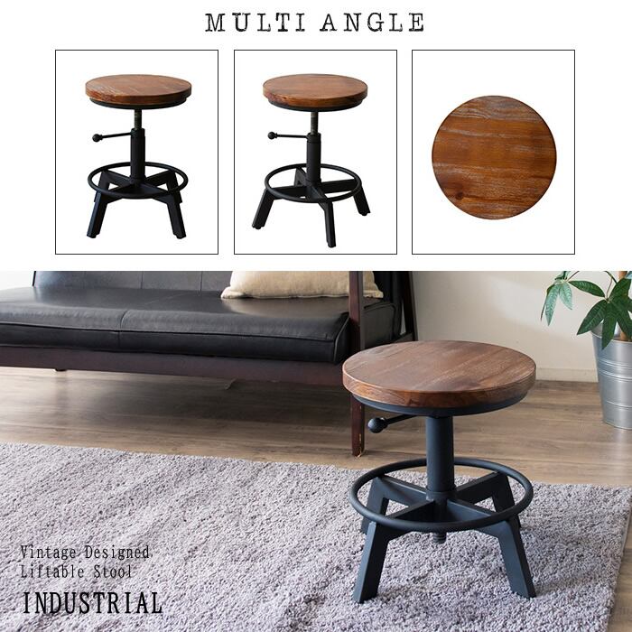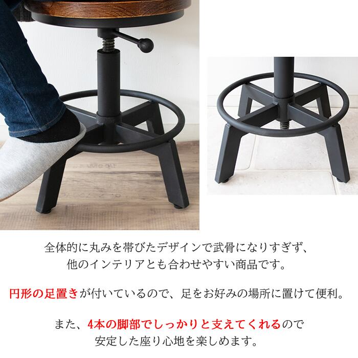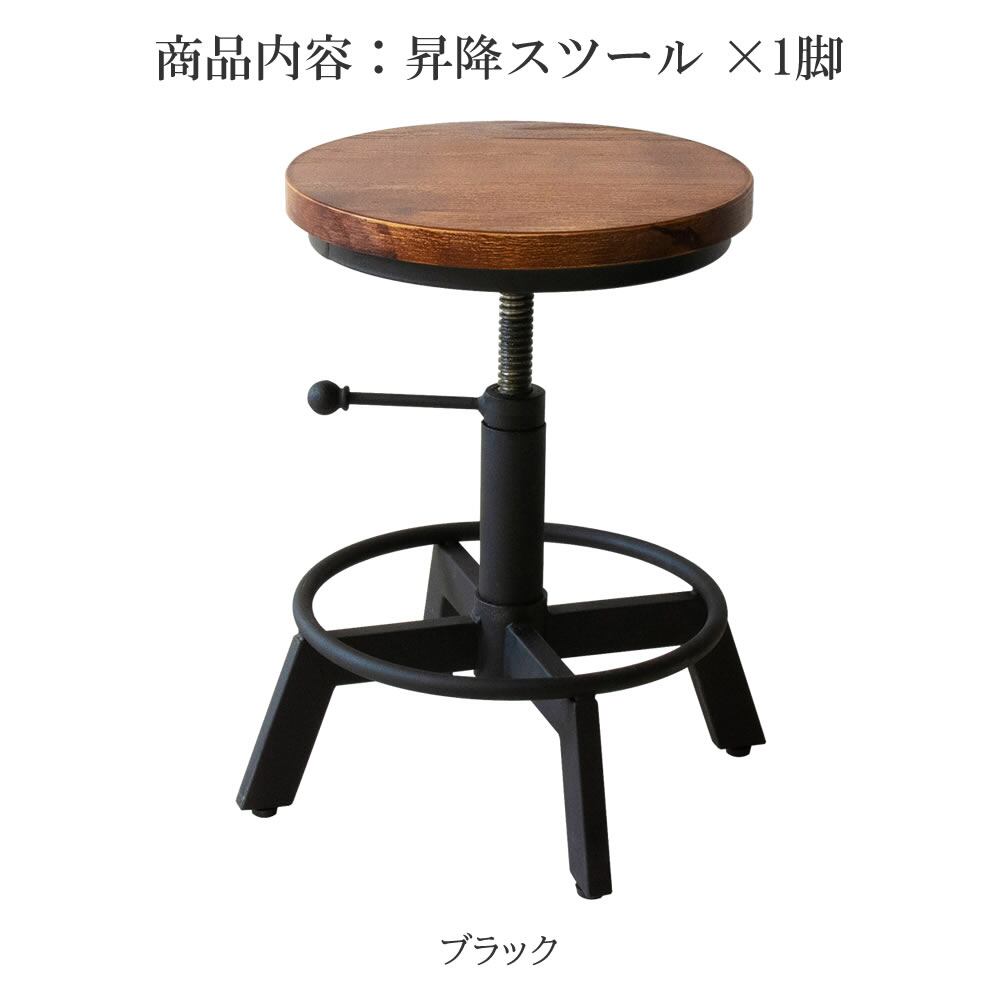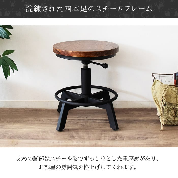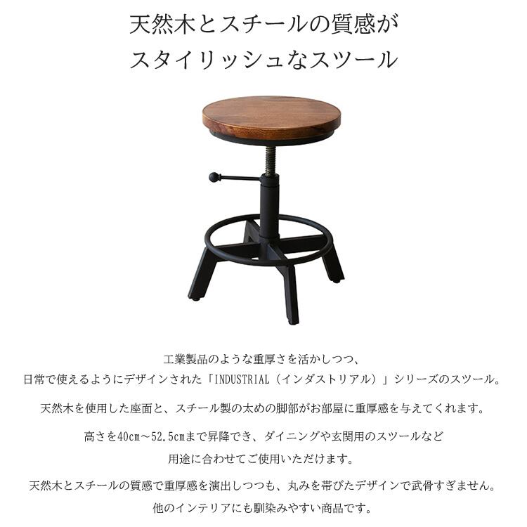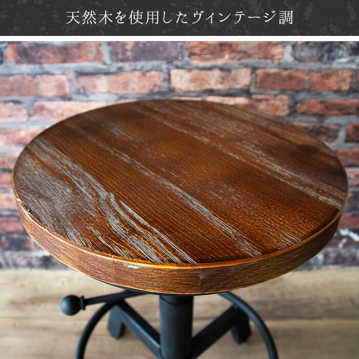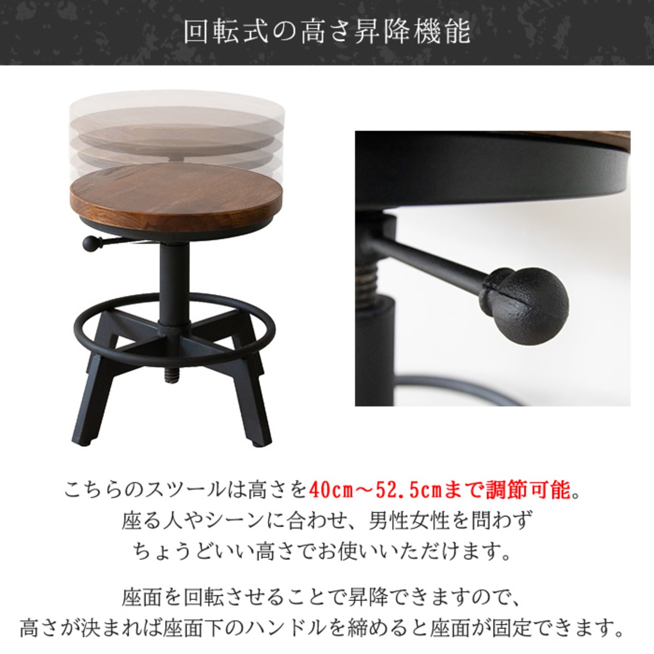 スツール 1脚 単品 44cm幅 ブラック 昇降式スツール 昇降スツール 玄関スツール 丸型 円形 丸形 円型スツール おすすめ おしゃれ ヴィンテージ調 天然木使用 スチールフレーム 高さ調整可能 ソファサイド ベッドサイド 玄関 幅44cm 奥行44cm 最大高さ52.5cm 最大座面高52.5cm