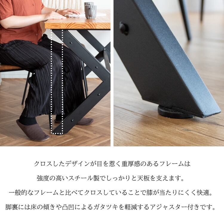 クロスしたデザインが目を惹く重厚感のあるフレームは強度の高いスチール製で、しっかりと天板を支えます。