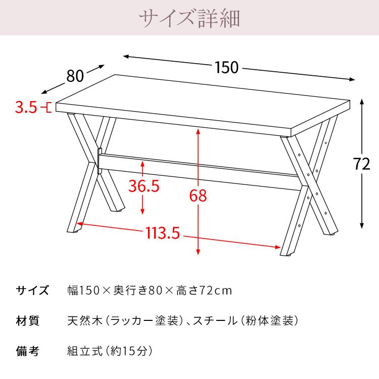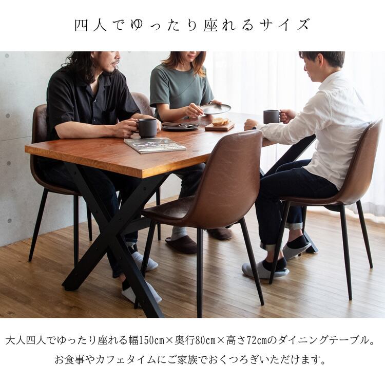 大人4人でユタtりと使用できる幅(約)150cm、奥行(約)80cm、高さ(約)72cmのダイニングテーブルは、お食事時の使用はもちろん、カフェタイムなどご家族でもゆったりとご使用いただけます。